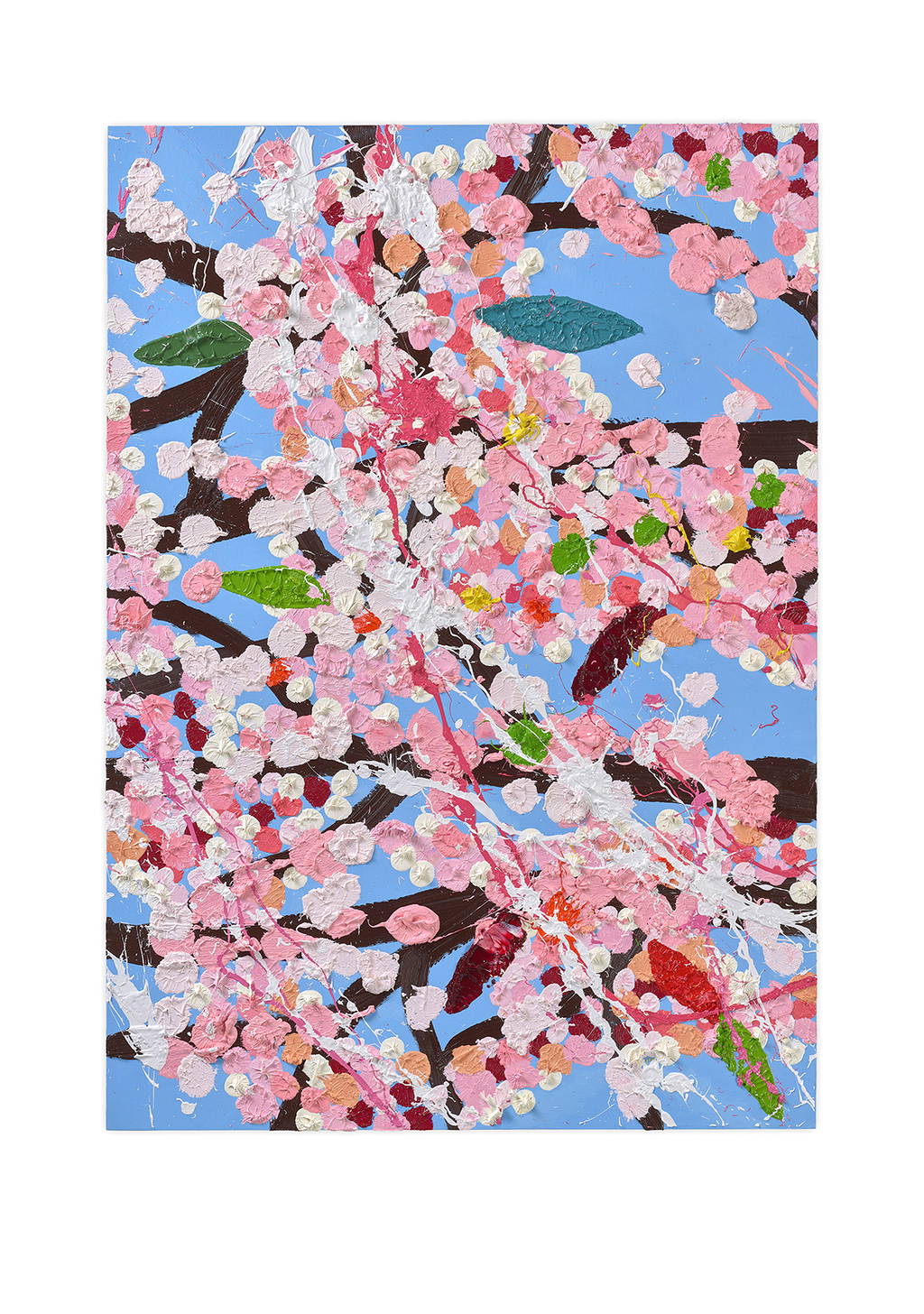 Paper Blossoms is a series of 900 unique original paintings on card featuring the vibrant imagery of Hirst's Cherry Blossoms paintings.