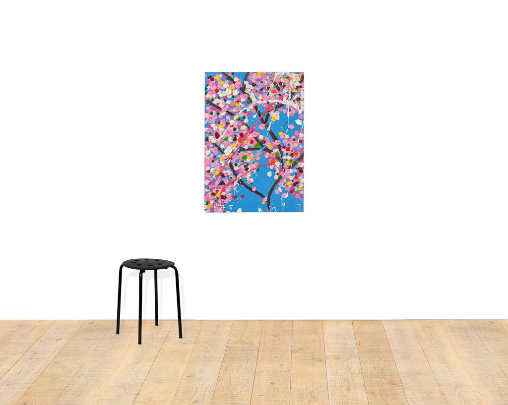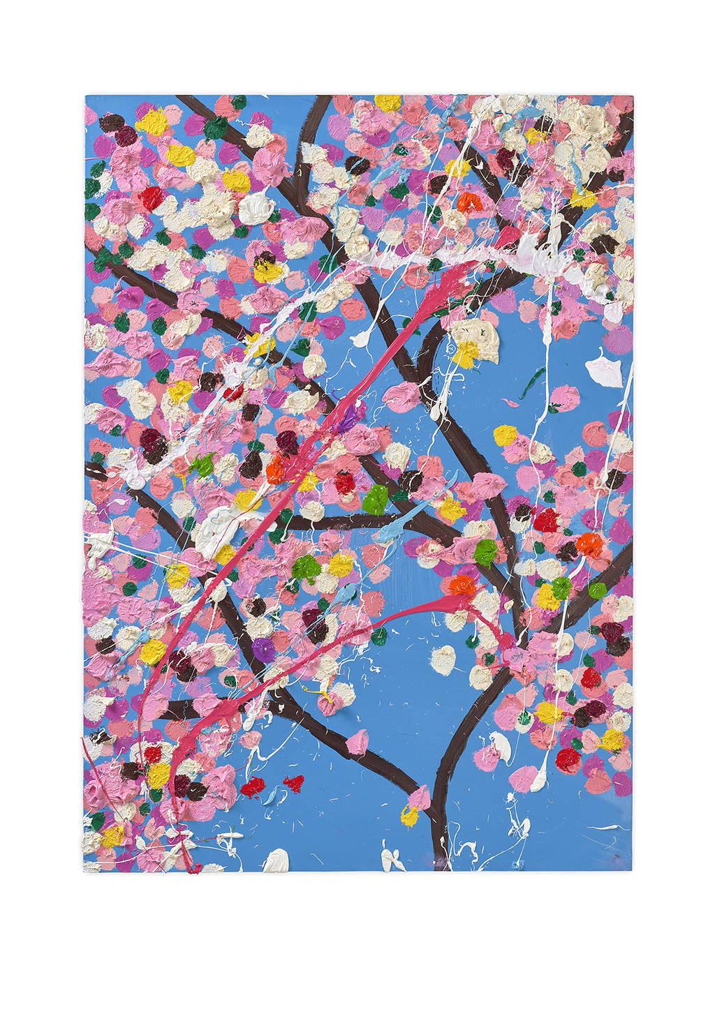 Paper Blossoms is a series of 900 unique original paintings on card featuring the vibrant imagery of Hirst's Cherry Blossoms paintings.
