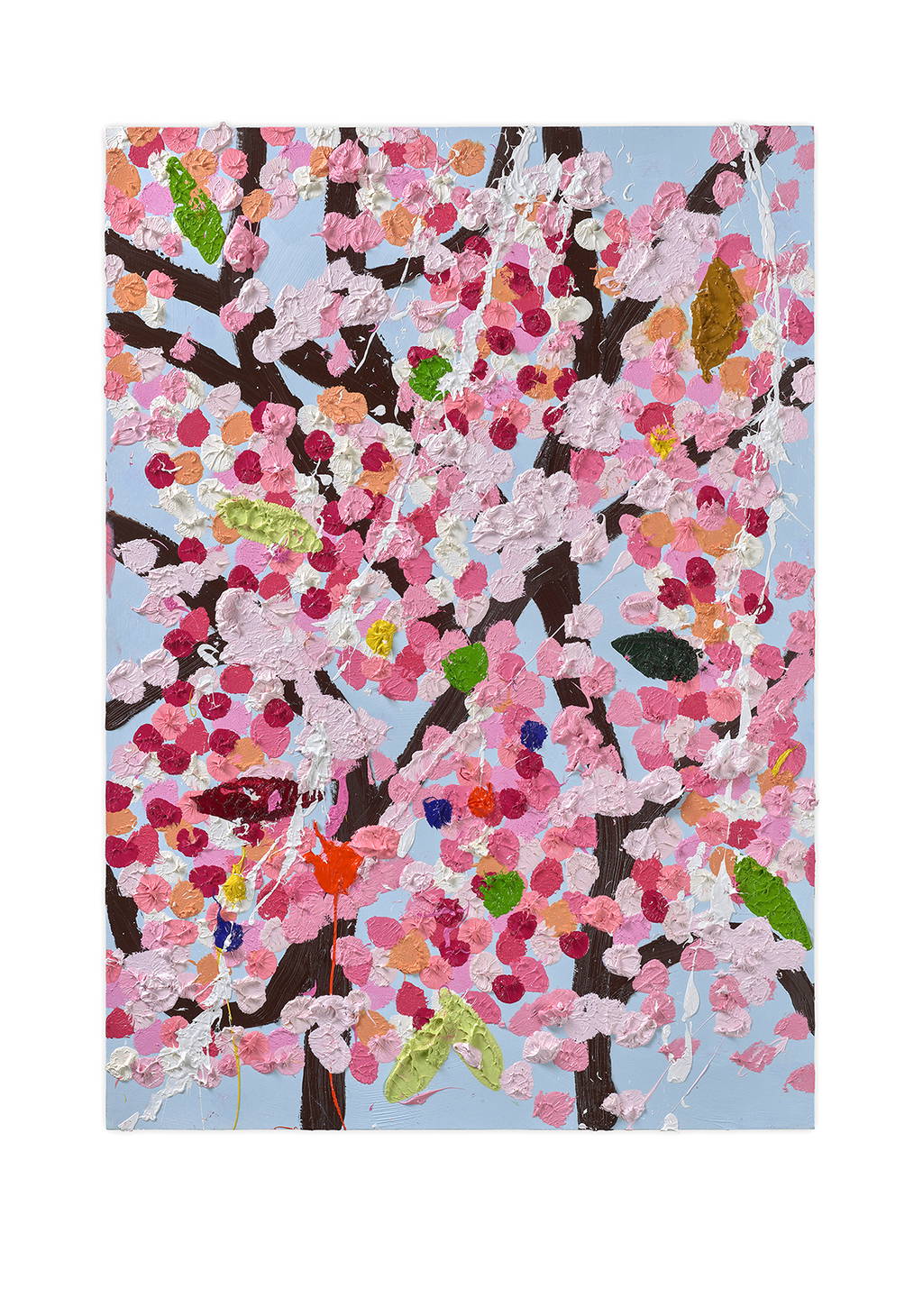 Paper Blossoms is a series of 900 unique original paintings on card featuring the vibrant imagery of Hirst's Cherry Blossoms paintings.