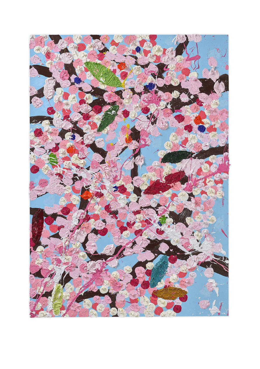 Paper Blossoms is a series of 900 unique original paintings on card featuring the vibrant imagery of Hirst's Cherry Blossoms paintings.