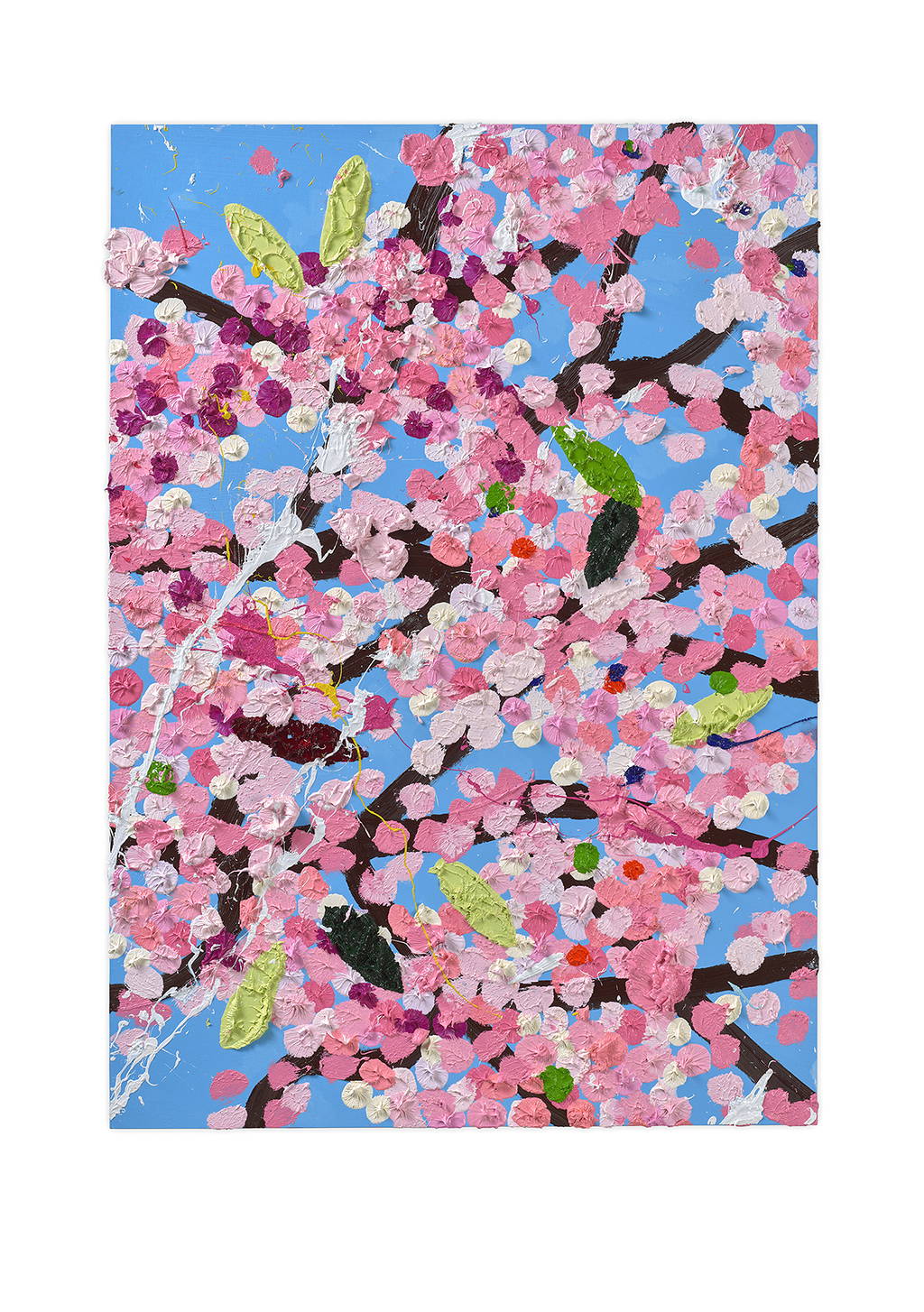 Paper Blossoms is a series of 900 unique original paintings on card featuring the vibrant imagery of Hirst's Cherry Blossoms paintings.