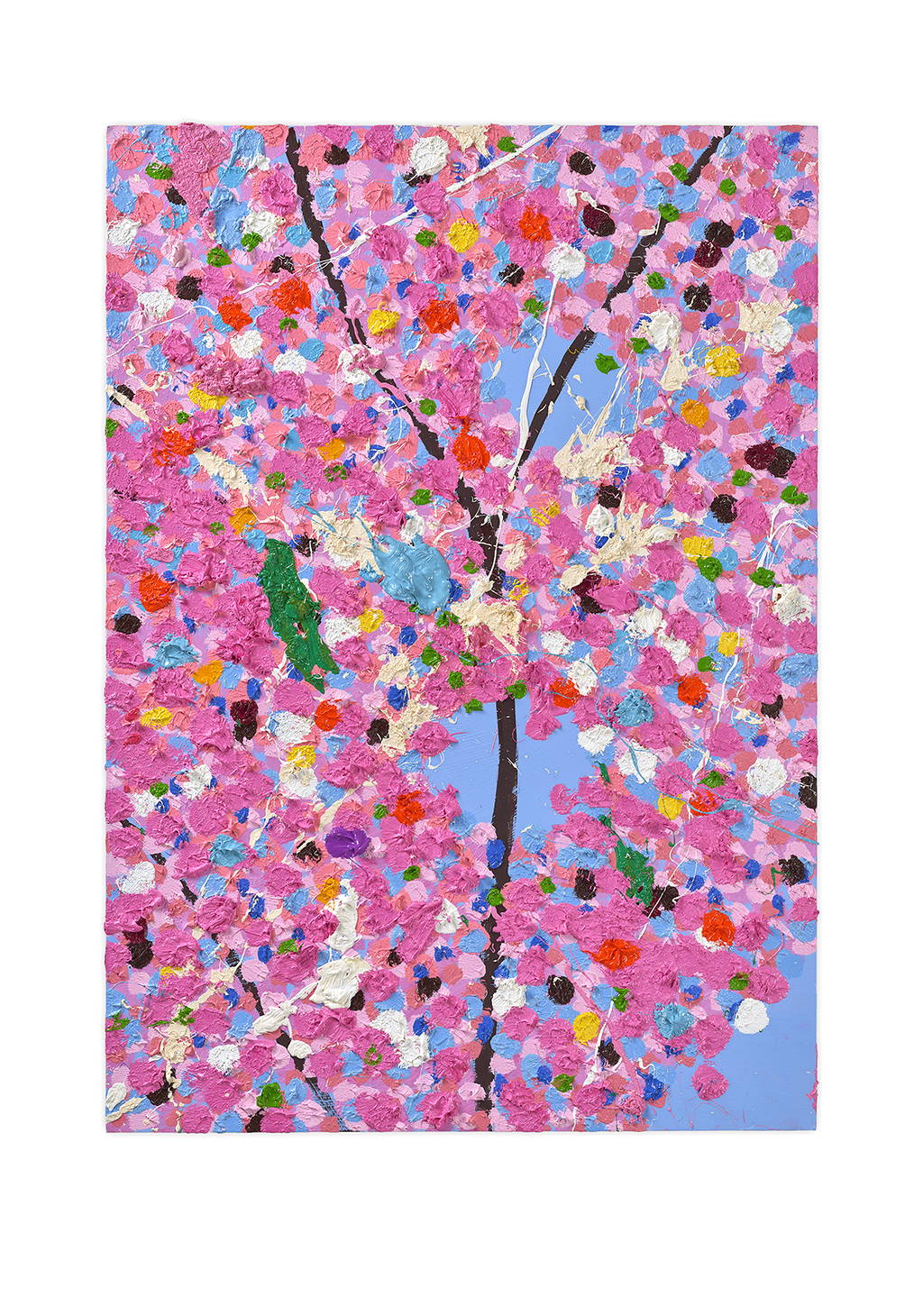 Paper Blossoms is a series of 900 unique original paintings on card featuring the vibrant imagery of Hirst's Cherry Blossoms paintings.