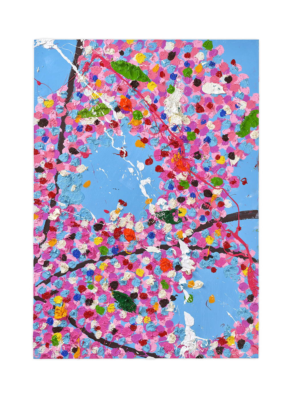 Paper Blossoms is a series of 900 unique original paintings on card featuring the vibrant imagery of Hirst's Cherry Blossoms paintings.