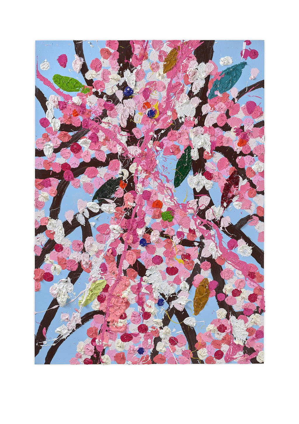 Paper Blossoms is a series of 900 unique original paintings on card featuring the vibrant imagery of Hirst's Cherry Blossoms paintings.