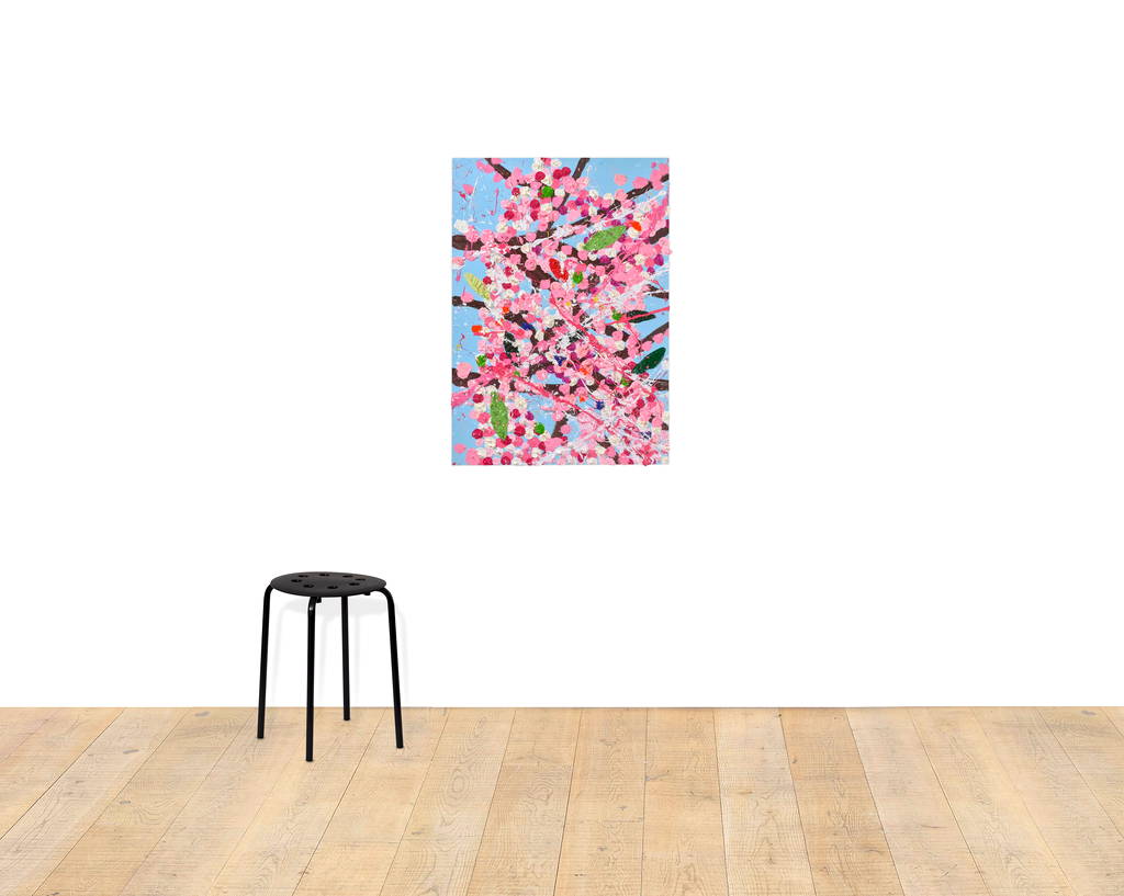 Paper Blossoms is a series of 900 unique original paintings on card featuring the vibrant imagery of Hirst's Cherry Blossoms paintings.