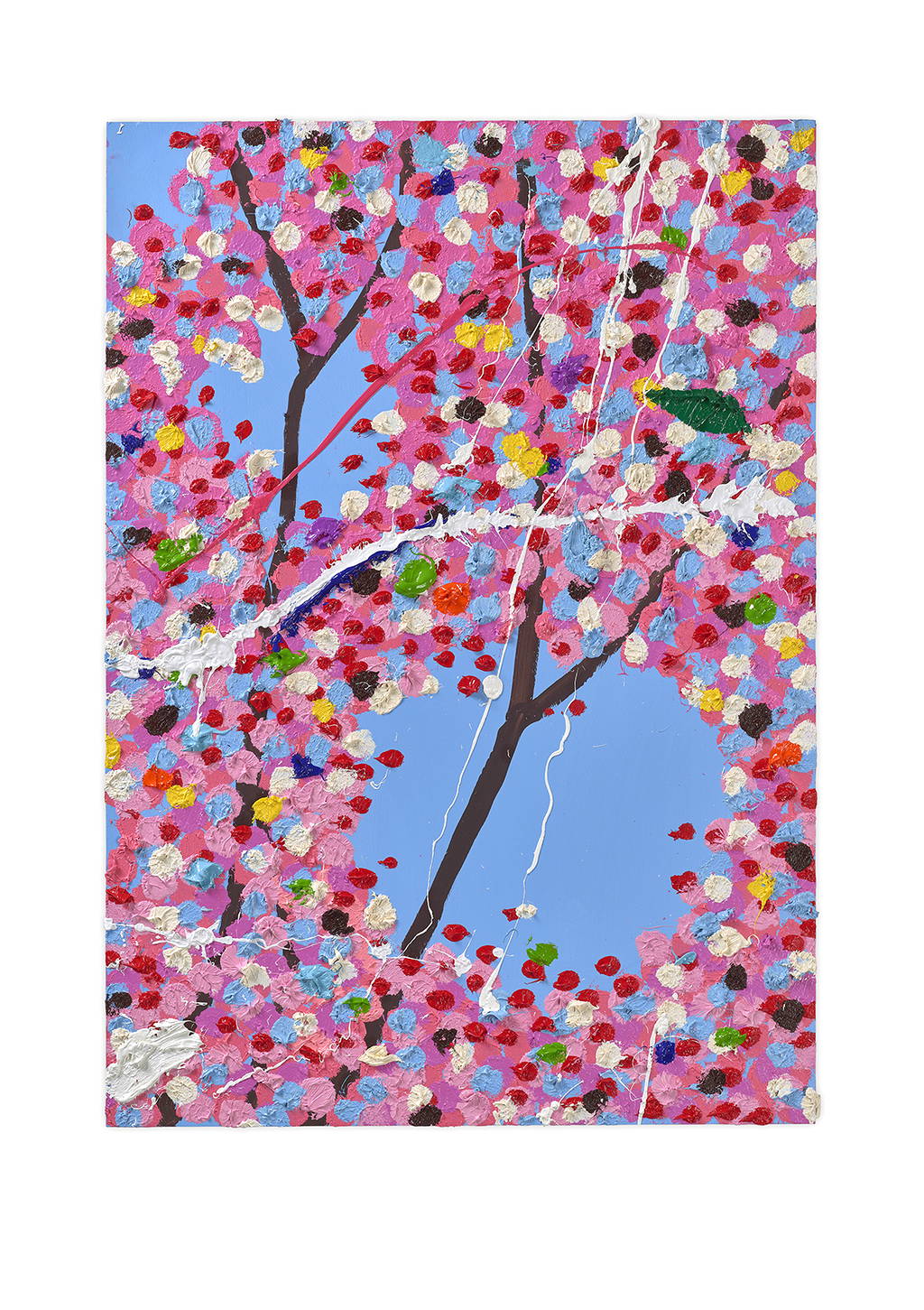 Paper Blossoms is a series of 900 unique original paintings on card featuring the vibrant imagery of Hirst's Cherry Blossoms paintings.