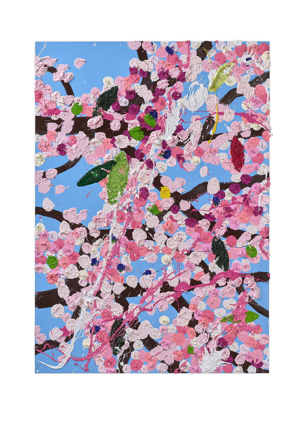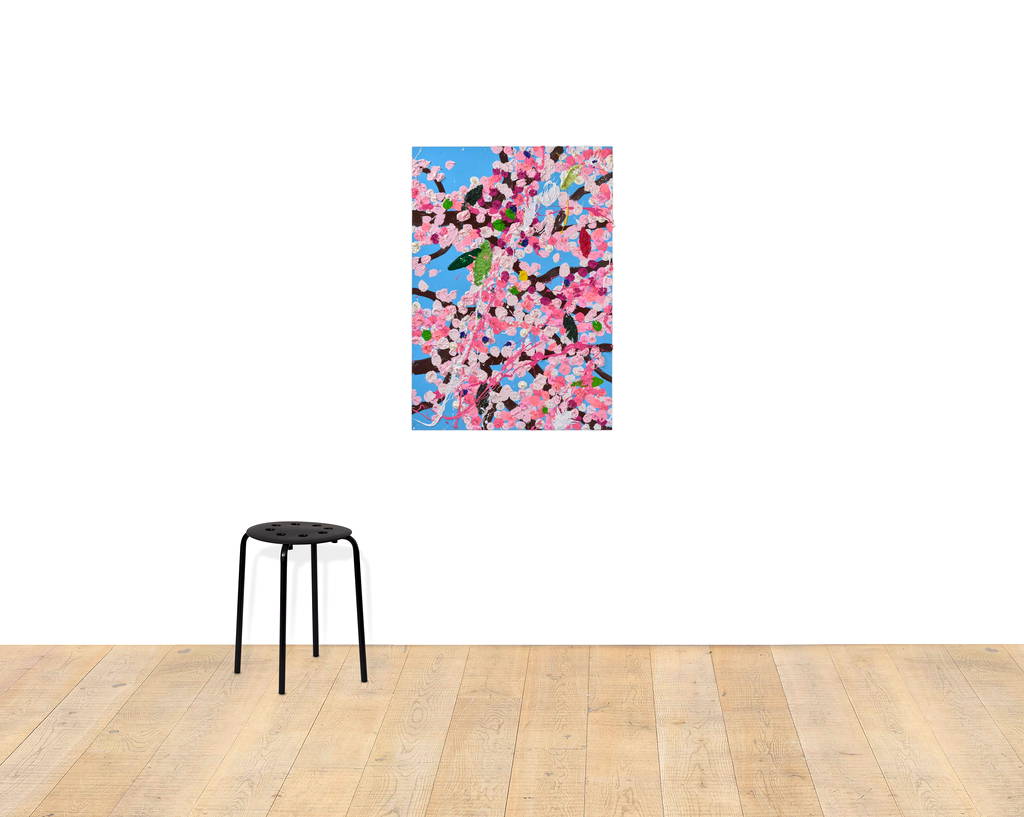 Paper Blossoms is a series of 900 unique original paintings on card featuring the vibrant imagery of Hirst's Cherry Blossoms paintings.