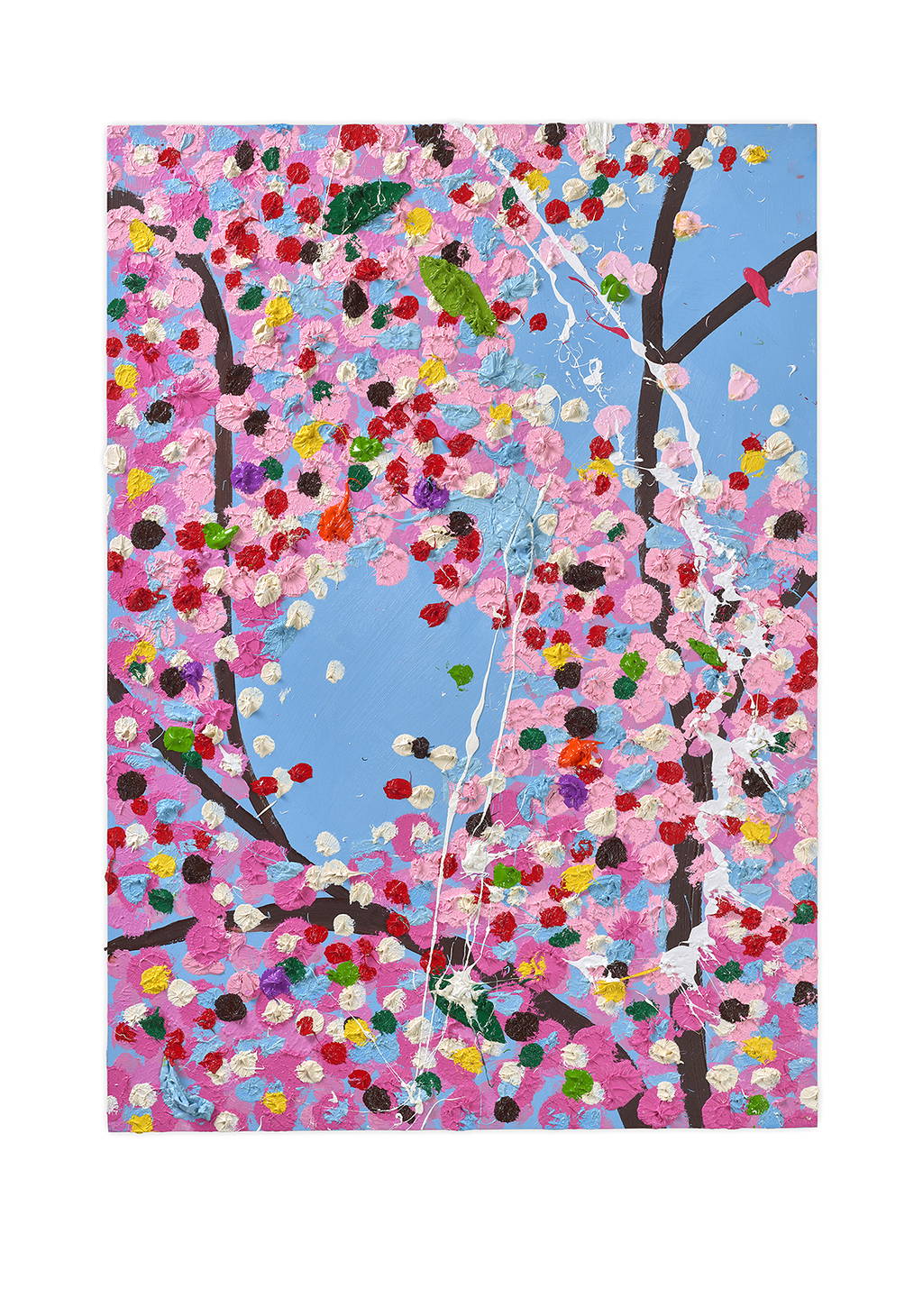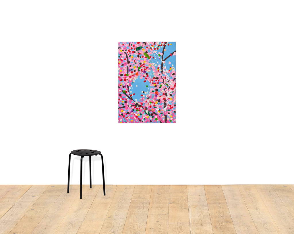 Paper Blossoms is a series of 900 unique original paintings on card featuring the vibrant imagery of Hirst's Cherry Blossoms paintings.