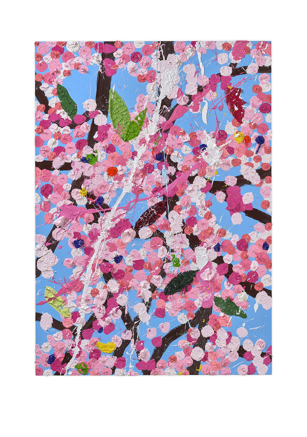 Paper Blossoms is a series of 900 unique original paintings on card featuring the vibrant imagery of Hirst's Cherry Blossoms paintings.