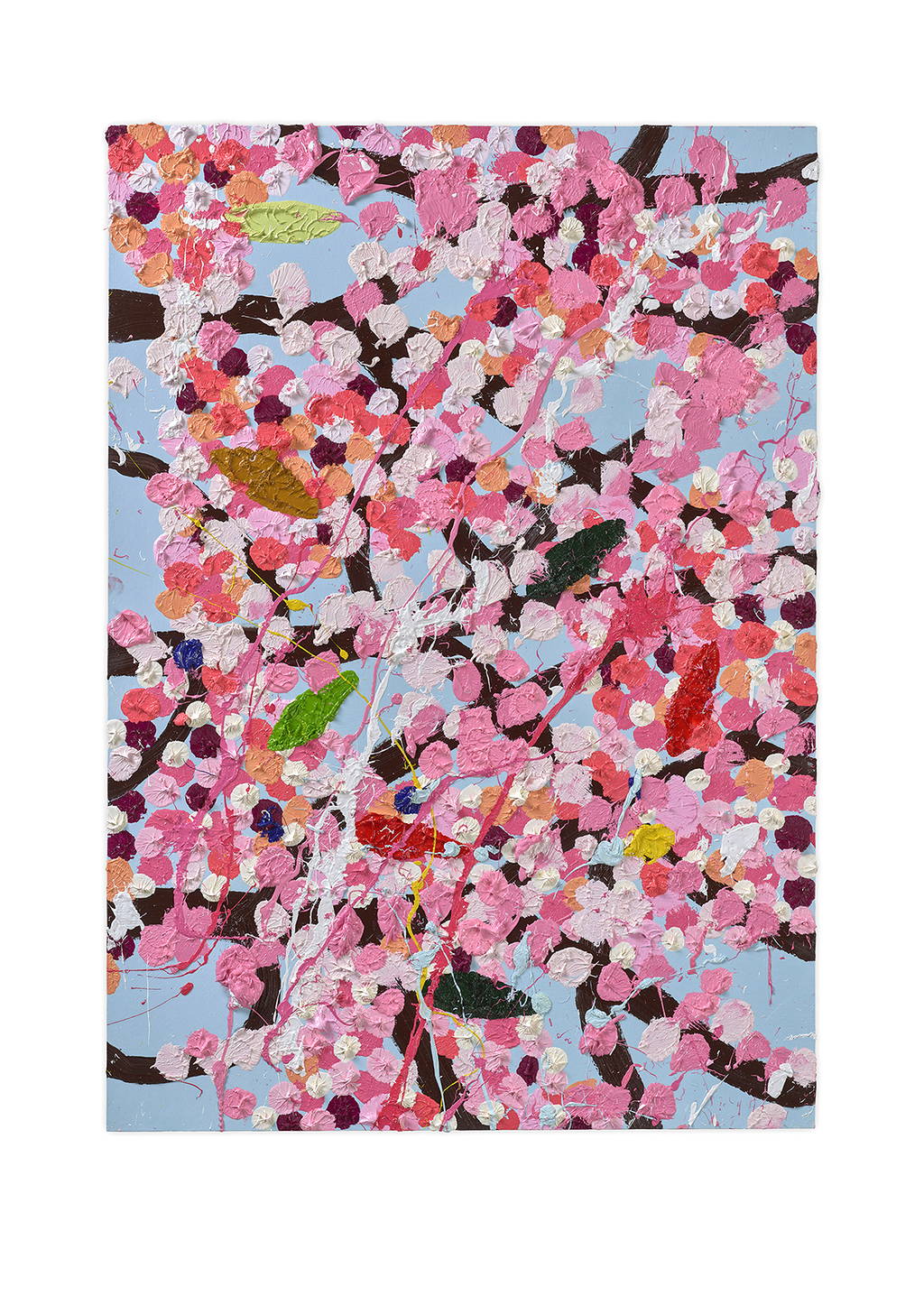 Paper Blossoms is a series of 900 unique original paintings on card featuring the vibrant imagery of Hirst's Cherry Blossoms paintings.