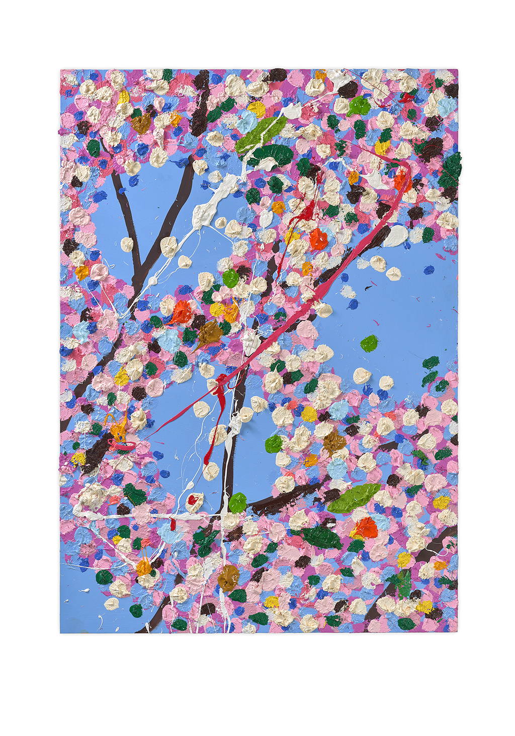 Paper Blossoms is a series of 900 unique original paintings on card featuring the vibrant imagery of Hirst's Cherry Blossoms paintings.