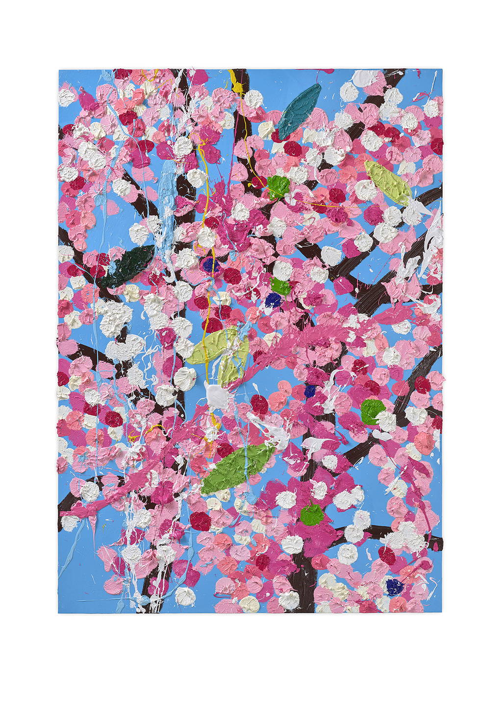 Paper Blossoms is a series of 900 unique original paintings on card featuring the vibrant imagery of Hirst's Cherry Blossoms paintings.