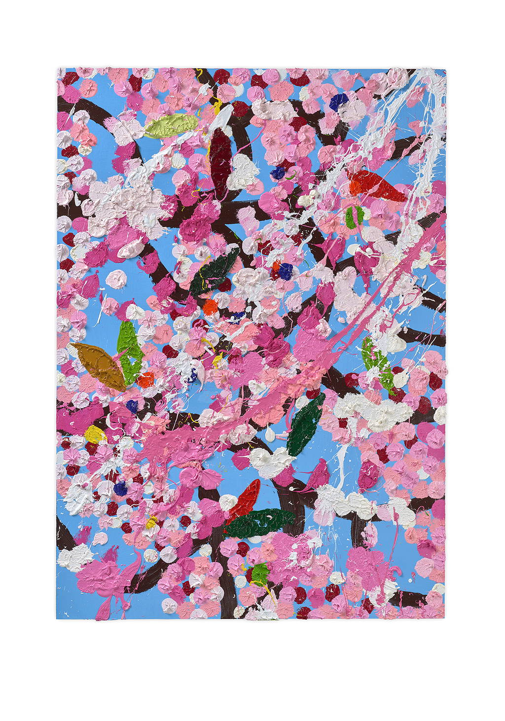 Paper Blossoms is a series of 900 unique original paintings on card featuring the vibrant imagery of Hirst's Cherry Blossoms paintings.