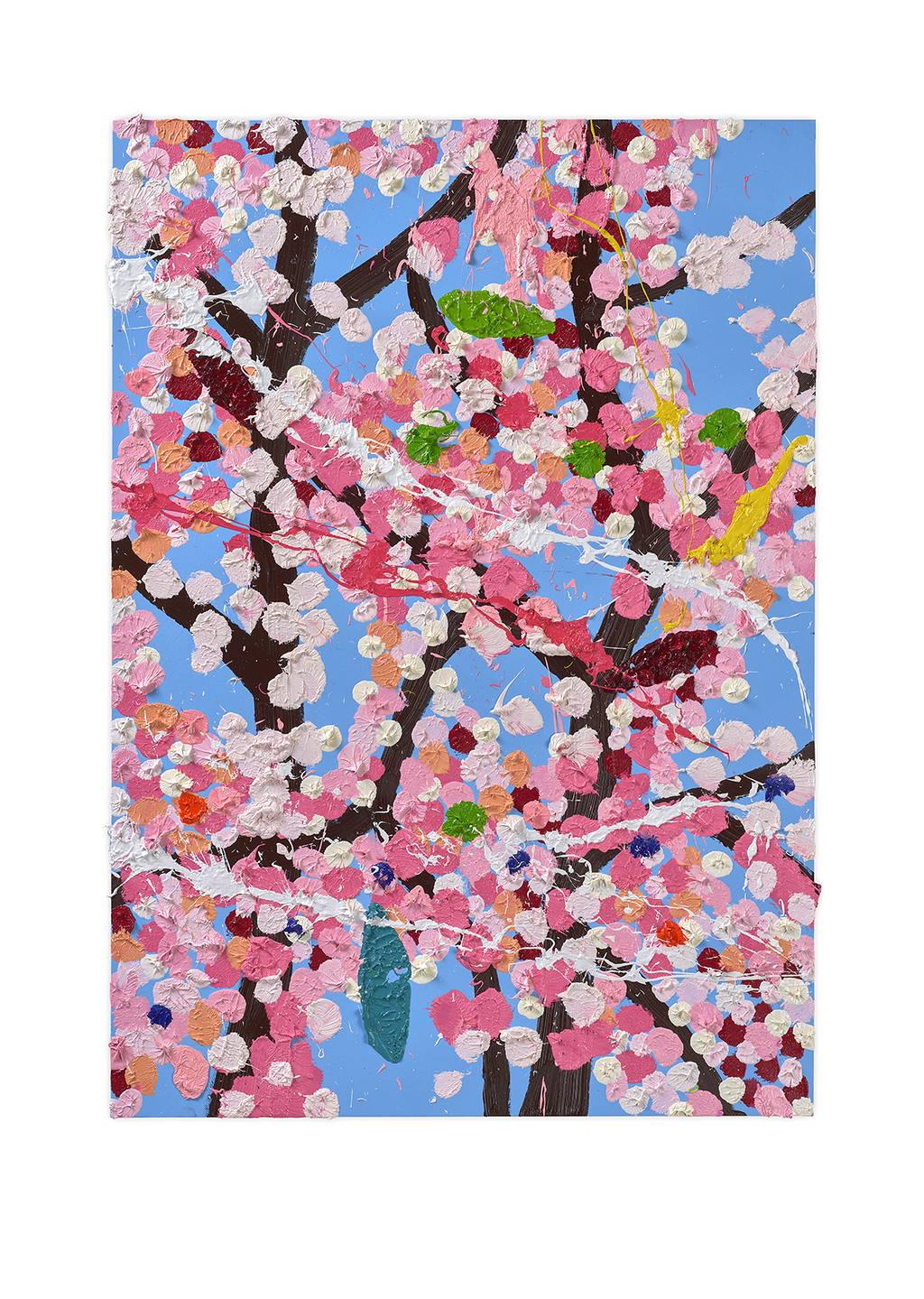 Paper Blossoms is a series of 900 unique original paintings on card featuring the vibrant imagery of Hirst's Cherry Blossoms paintings.