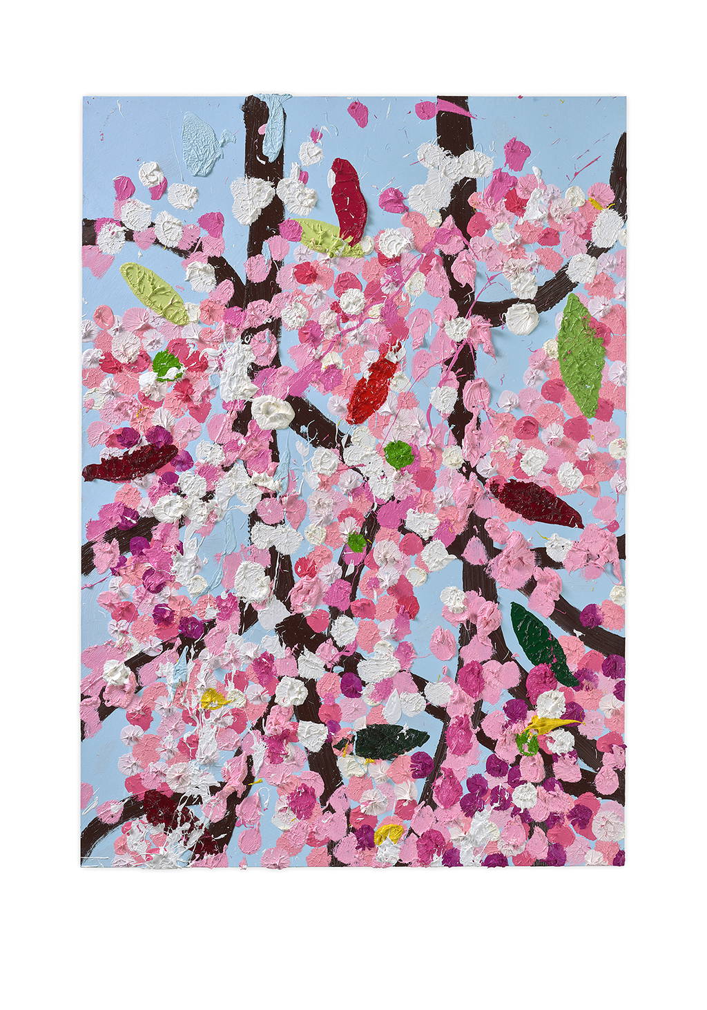 Paper Blossoms is a series of 900 unique original paintings on card featuring the vibrant imagery of Hirst's Cherry Blossoms paintings.