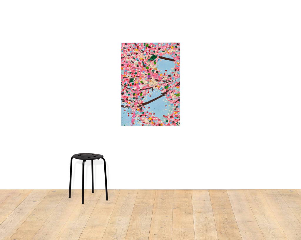 Paper Blossoms is a series of 900 unique original paintings on card featuring the vibrant imagery of Hirst's Cherry Blossoms paintings.