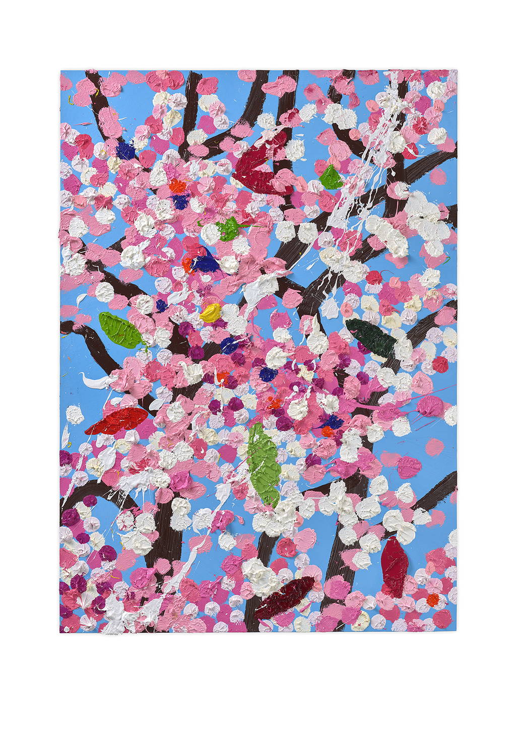 Paper Blossoms is a series of 900 unique original paintings on card featuring the vibrant imagery of Hirst's Cherry Blossoms paintings.