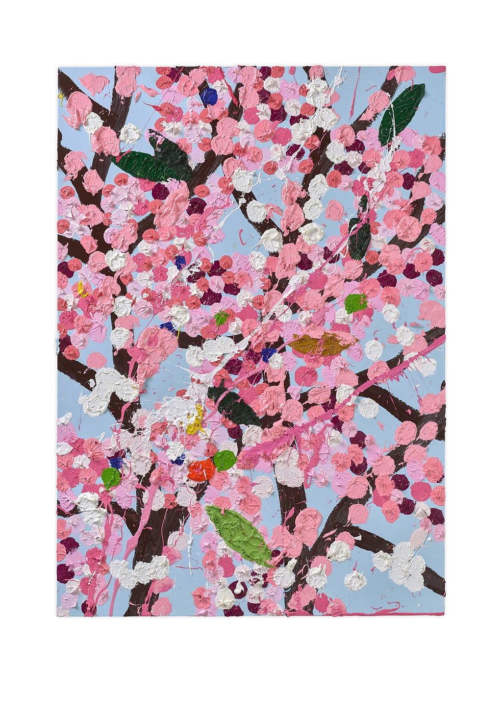 Paper Blossoms is a series of 900 unique original paintings on card featuring the vibrant imagery of Hirst's Cherry Blossoms paintings.