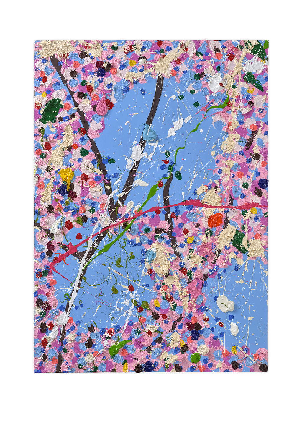 Paper Blossoms is a series of 900 unique original paintings on card featuring the vibrant imagery of Hirst's Cherry Blossoms paintings.