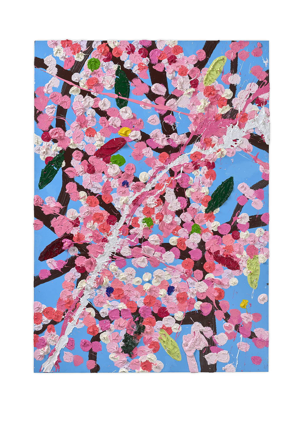 Paper Blossoms is a series of 900 unique original paintings on card featuring the vibrant imagery of Hirst's Cherry Blossoms paintings.
