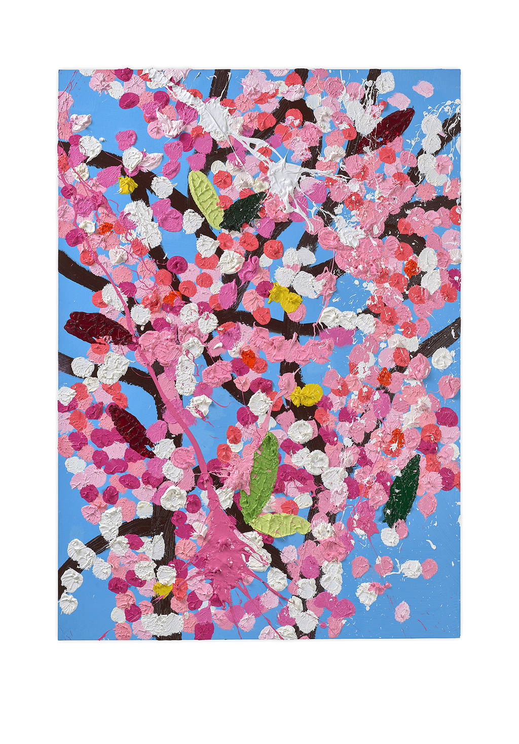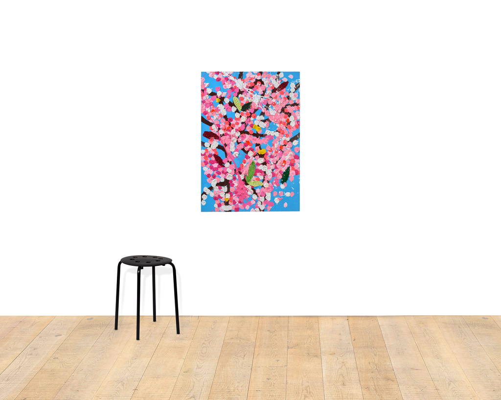 Paper Blossoms is a series of 900 unique original paintings on card featuring the vibrant imagery of Hirst's Cherry Blossoms paintings.