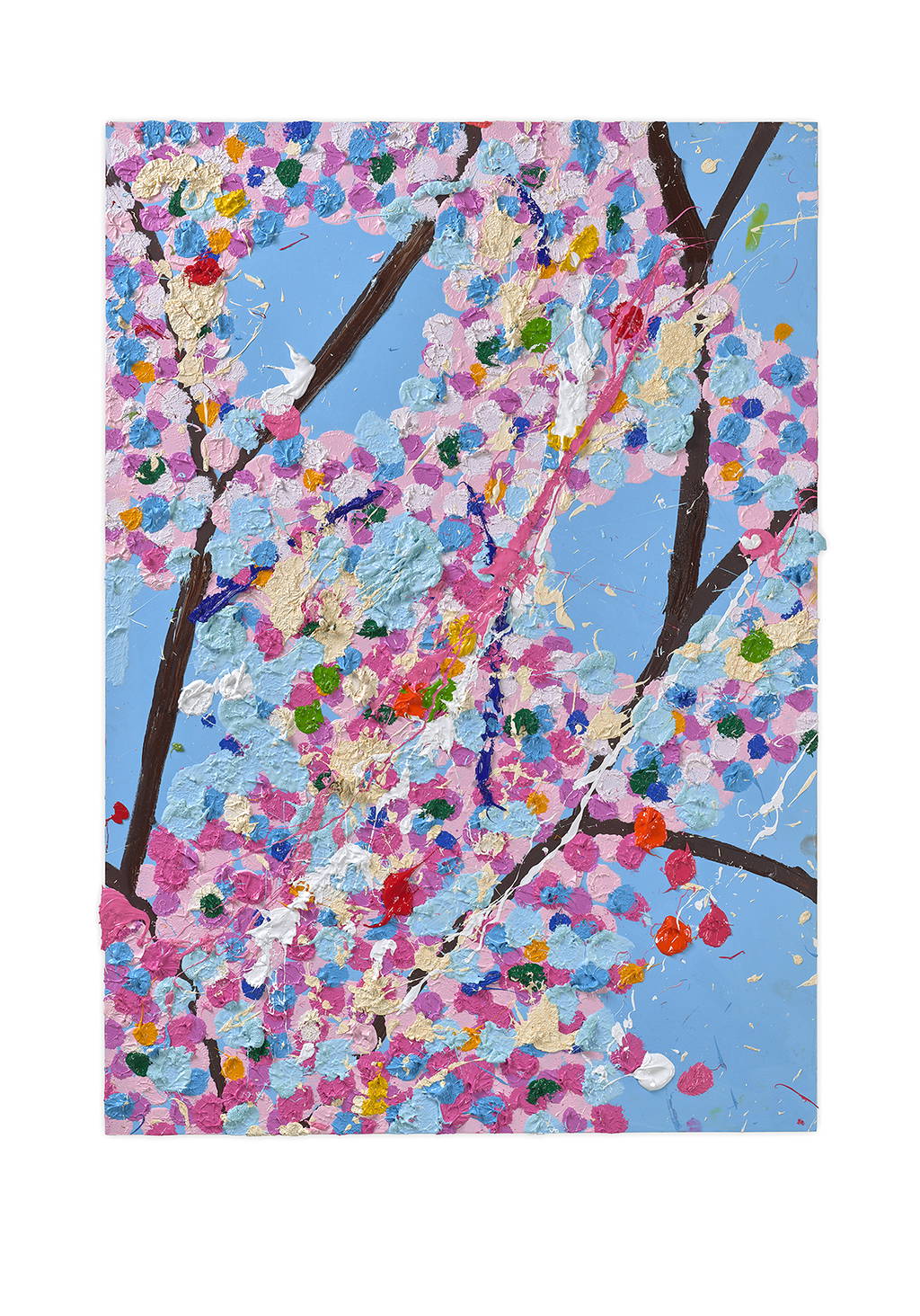 Paper Blossoms is a series of 900 unique original paintings on card featuring the vibrant imagery of Hirst's Cherry Blossoms paintings.