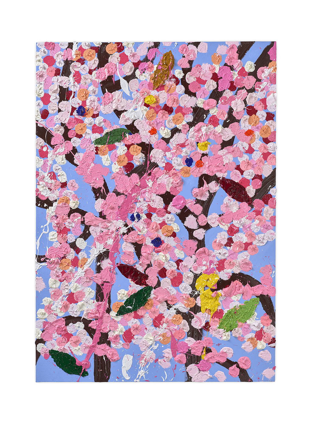 Paper Blossoms is a series of 900 unique original paintings on card featuring the vibrant imagery of Hirst's Cherry Blossoms paintings.