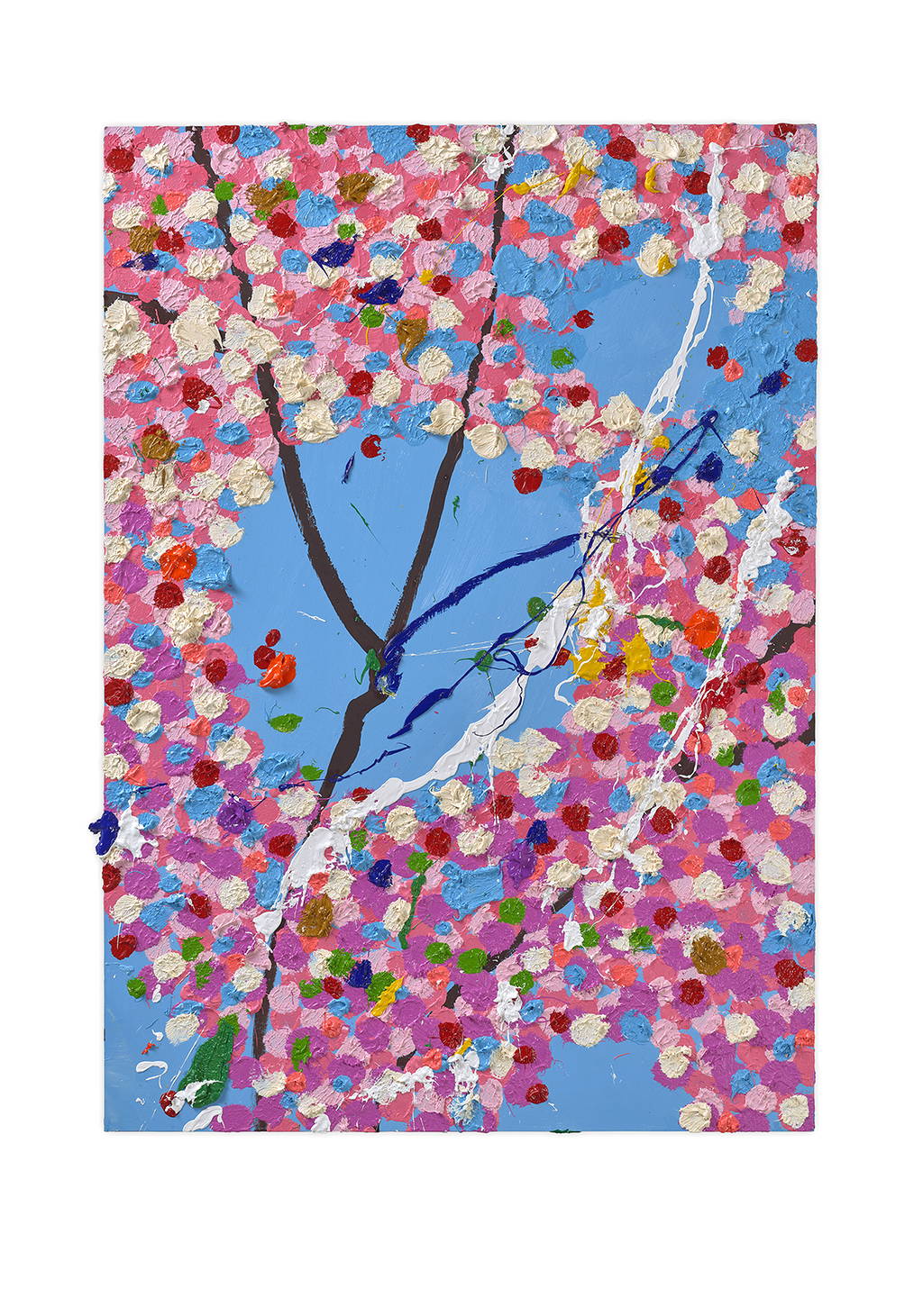 Paper Blossoms is a series of 900 unique original paintings on card featuring the vibrant imagery of Hirst's Cherry Blossoms paintings.