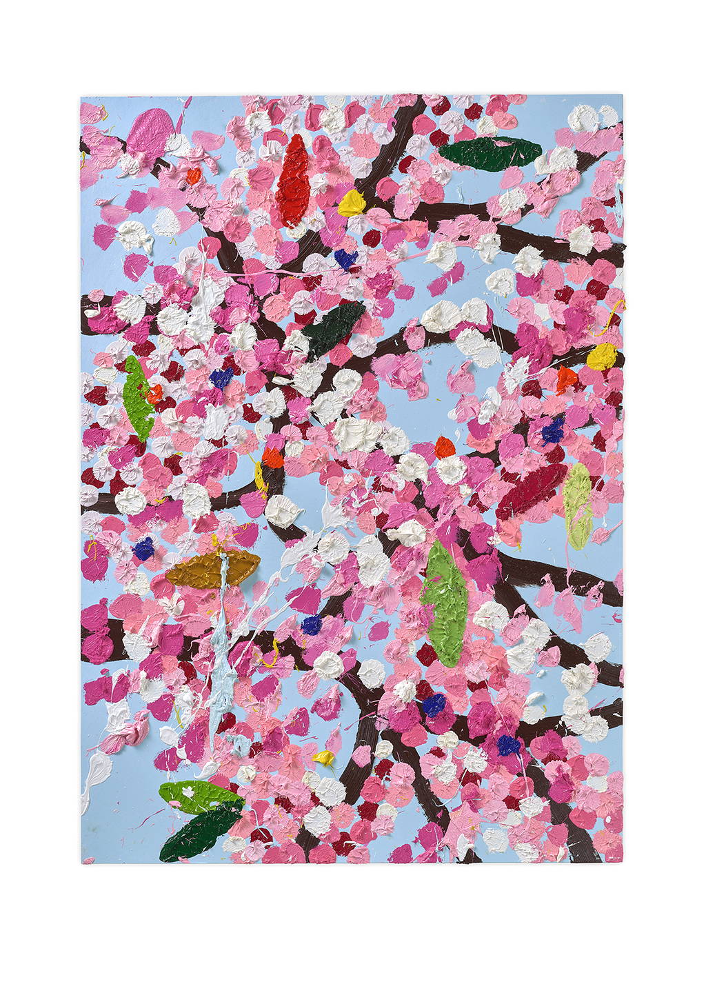 Paper Blossoms is a series of 900 unique original paintings on card featuring the vibrant imagery of Hirst's Cherry Blossoms paintings.