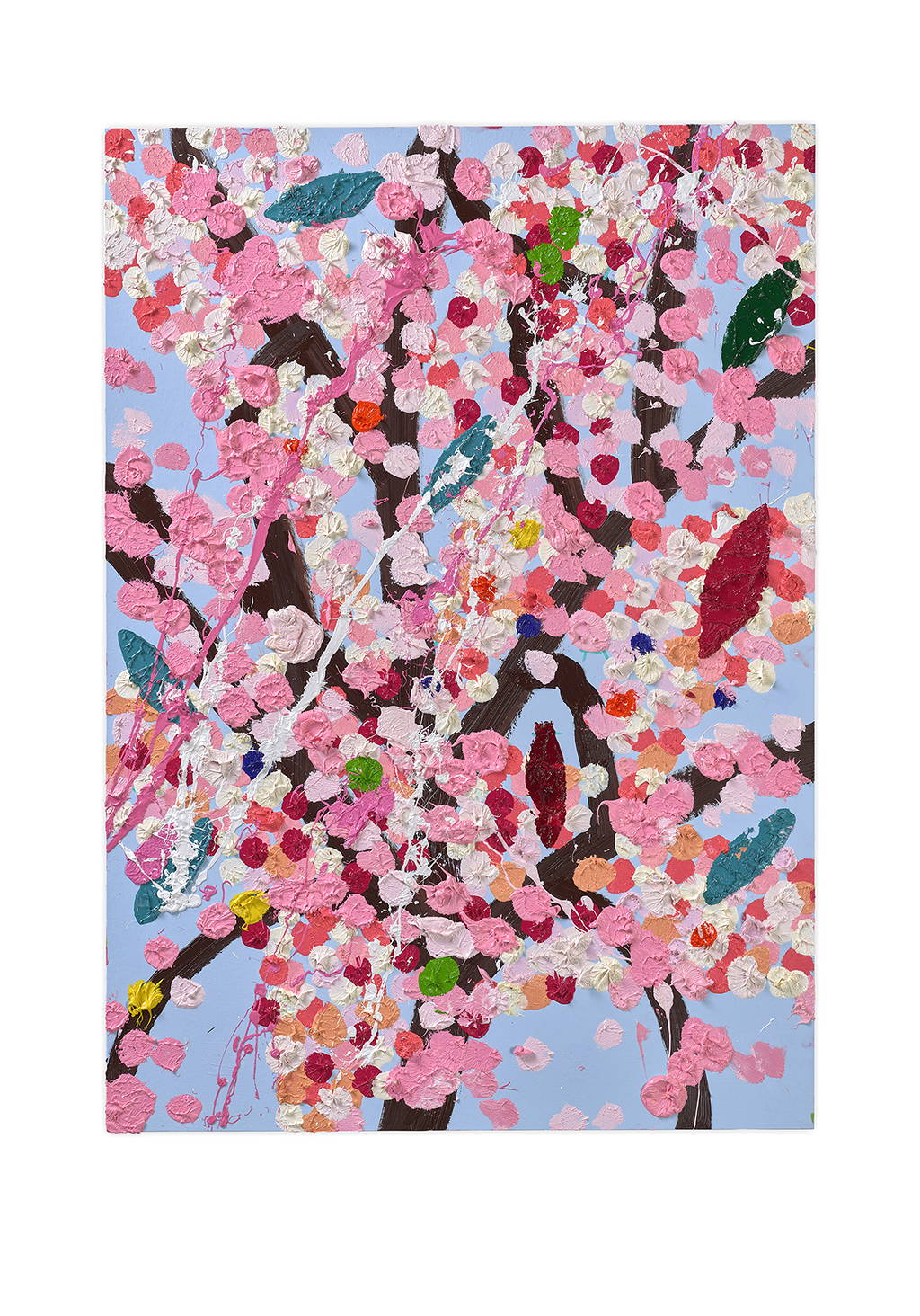 Paper Blossoms is a series of 900 unique original paintings on card featuring the vibrant imagery of Hirst's Cherry Blossoms paintings.