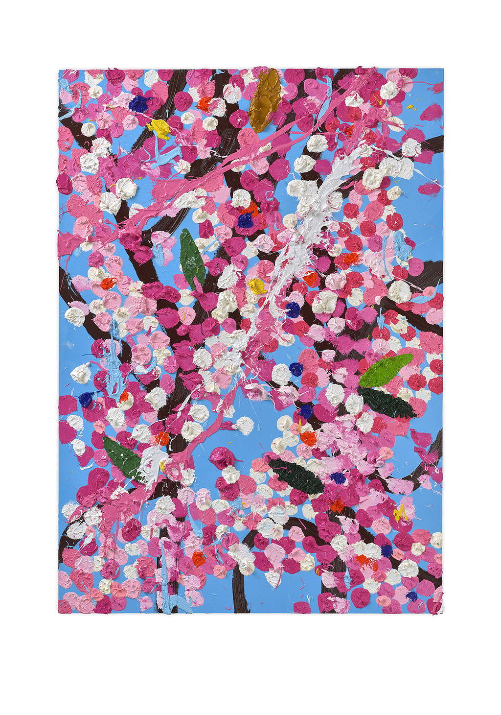 Paper Blossoms is a series of 900 unique original paintings on card featuring the vibrant imagery of Hirst's Cherry Blossoms paintings.