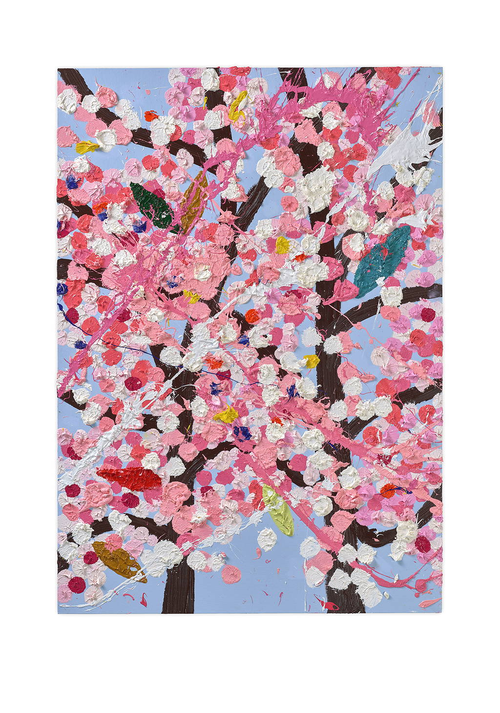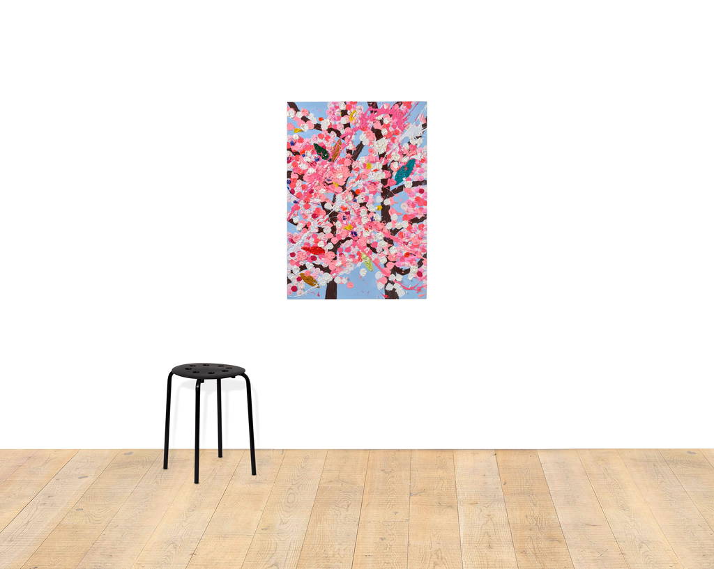 Paper Blossoms is a series of 900 unique original paintings on card featuring the vibrant imagery of Hirst's Cherry Blossoms paintings.