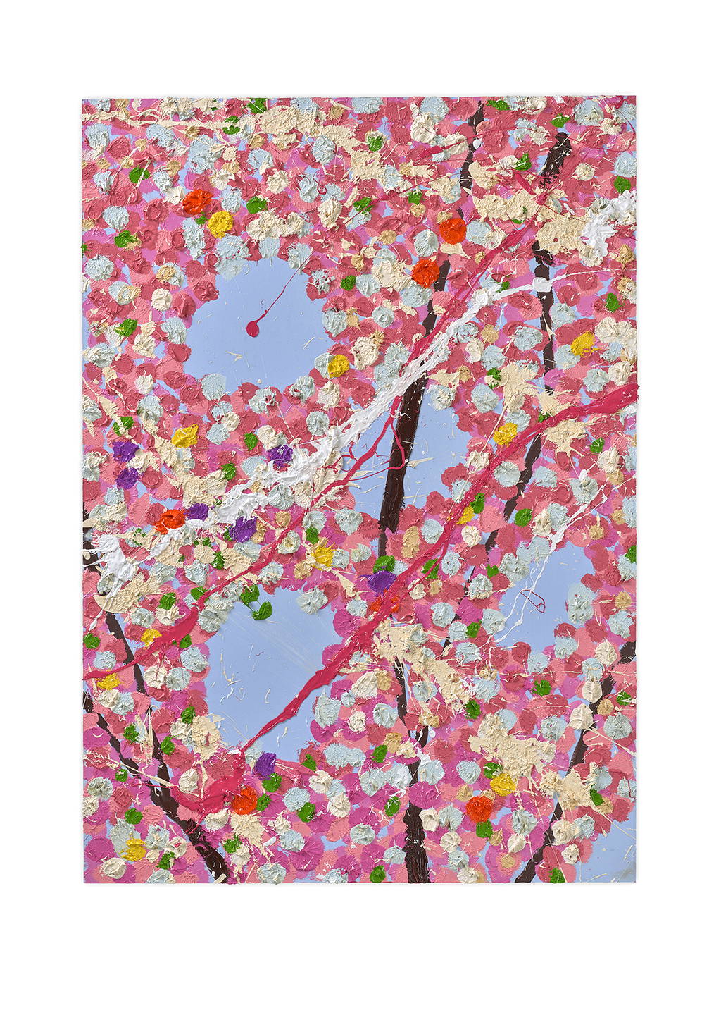 Paper Blossoms is a series of 900 unique original paintings on card featuring the vibrant imagery of Hirst's Cherry Blossoms paintings.