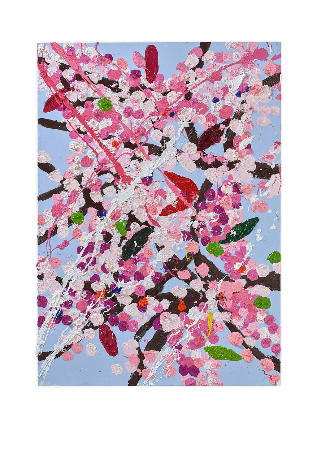 Paper Blossoms is a series of 900 unique original paintings on card featuring the vibrant imagery of Hirst's Cherry Blossoms paintings.
