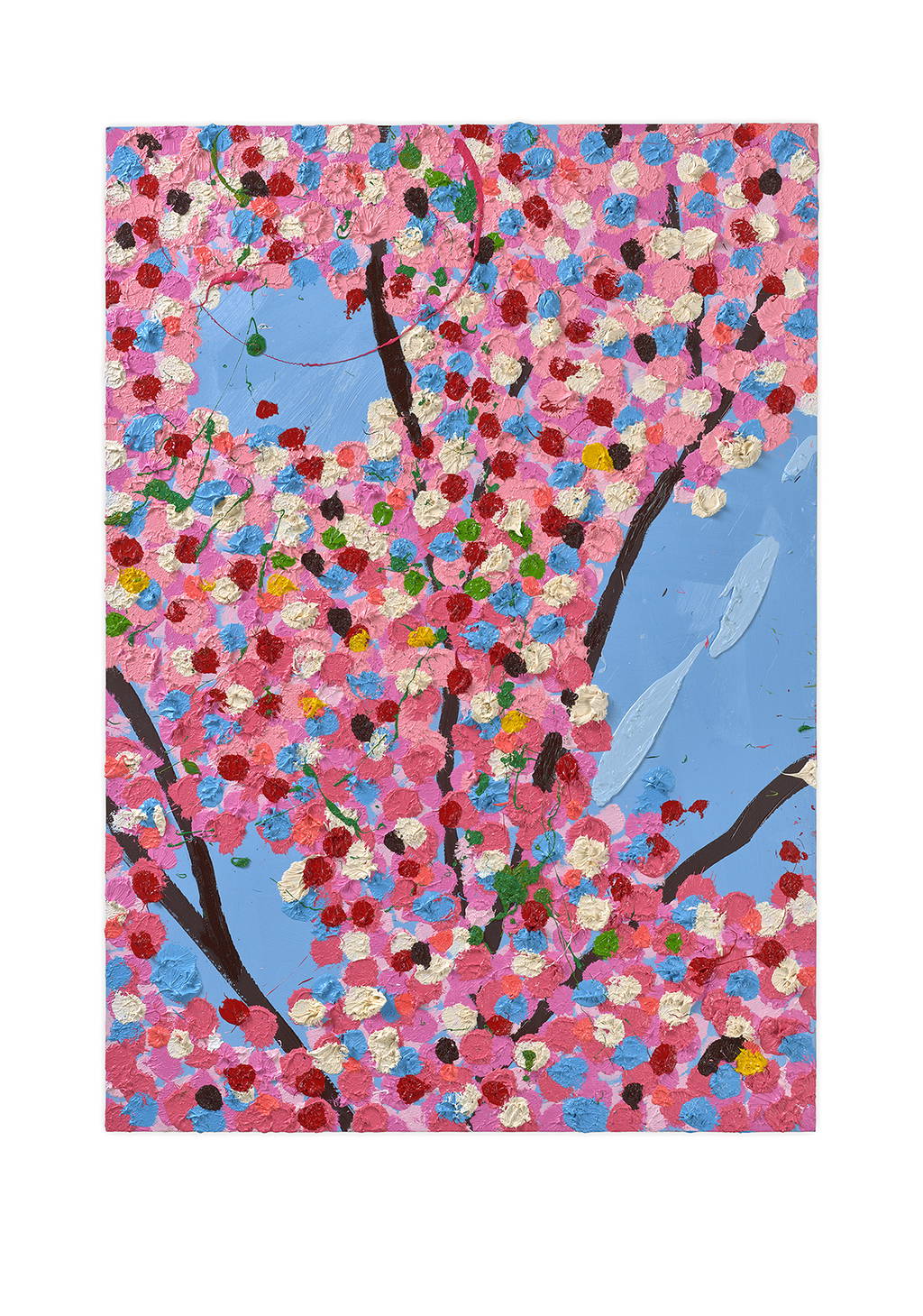 Paper Blossoms is a series of 900 unique original paintings on card featuring the vibrant imagery of Hirst's Cherry Blossoms paintings.