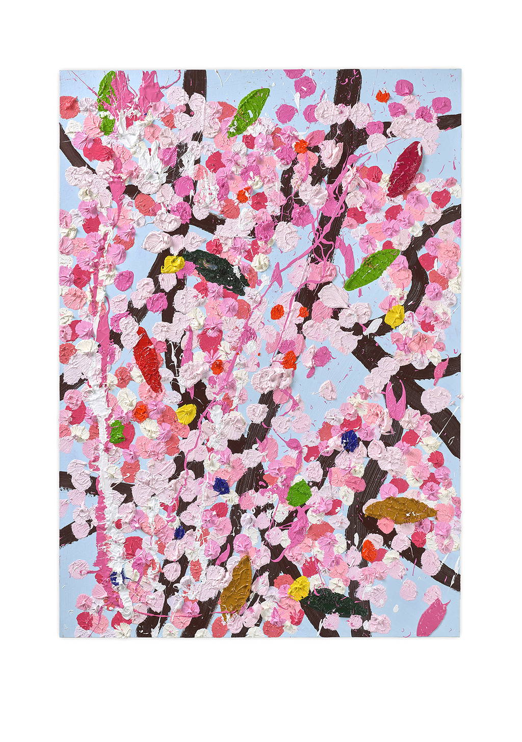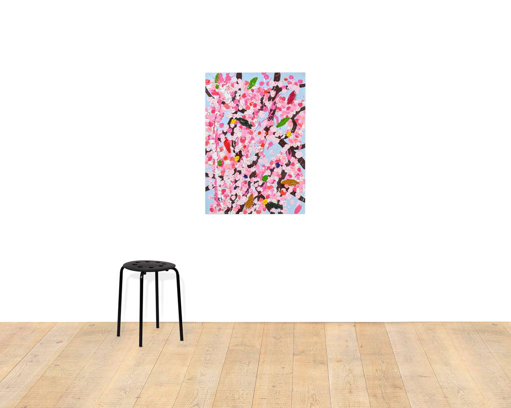 Paper Blossoms is a series of 900 unique original paintings on card featuring the vibrant imagery of Hirst's Cherry Blossoms paintings.
