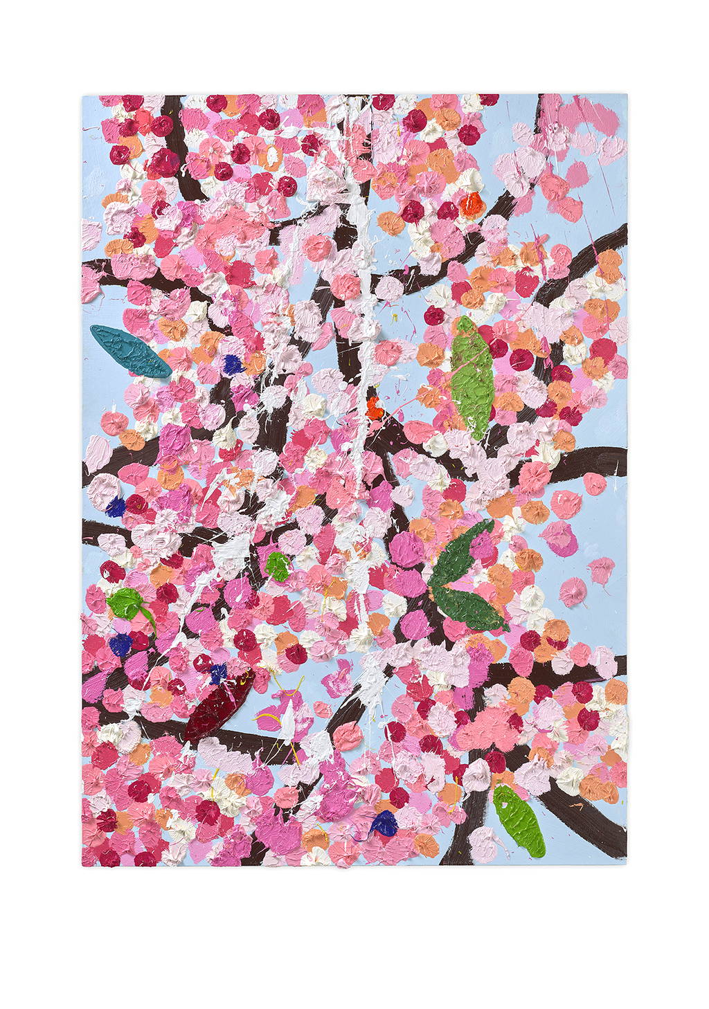 Paper Blossoms is a series of 900 unique original paintings on card featuring the vibrant imagery of Hirst's Cherry Blossoms paintings.