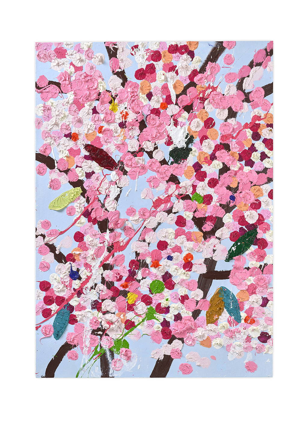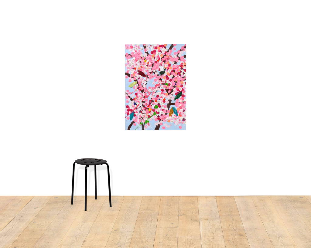 Paper Blossoms is a series of 900 unique original paintings on card featuring the vibrant imagery of Hirst's Cherry Blossoms paintings.