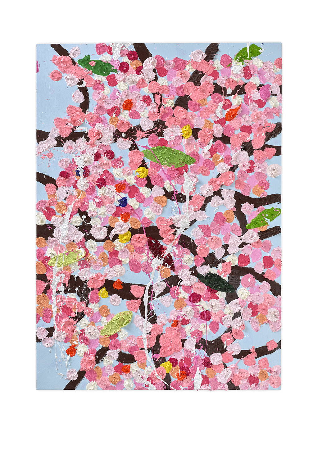 Paper Blossoms is a series of 900 unique original paintings on card featuring the vibrant imagery of Hirst's Cherry Blossoms paintings.