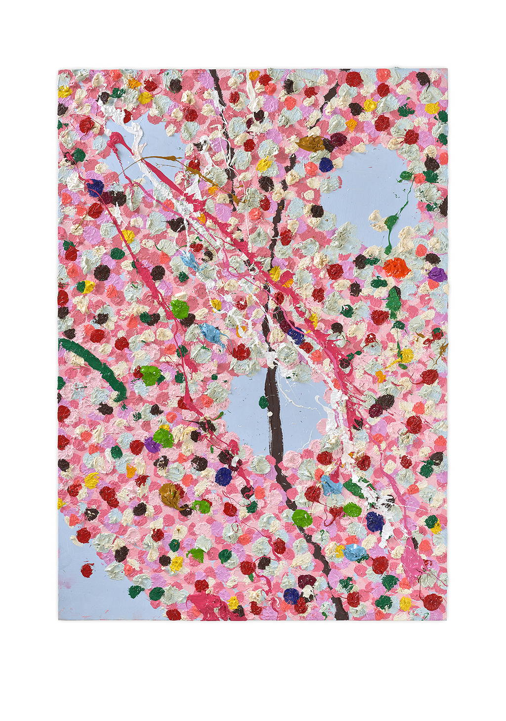 Paper Blossoms is a series of 900 unique original paintings on card featuring the vibrant imagery of Hirst's Cherry Blossoms paintings.