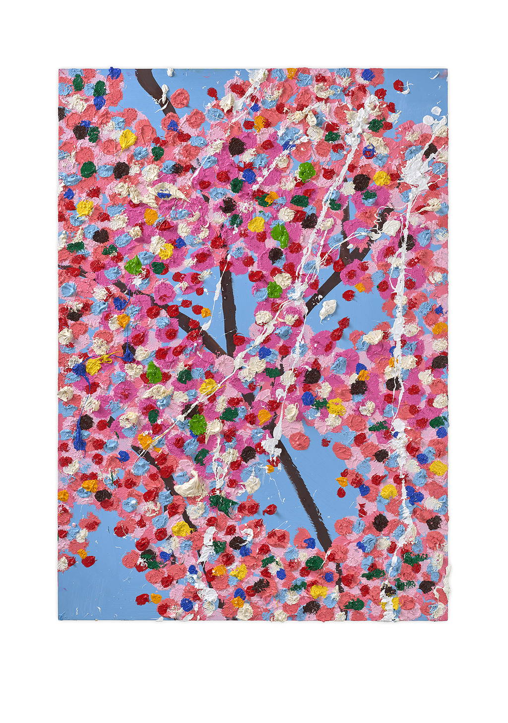 Paper Blossoms is a series of 900 unique original paintings on card featuring the vibrant imagery of Hirst's Cherry Blossoms paintings.