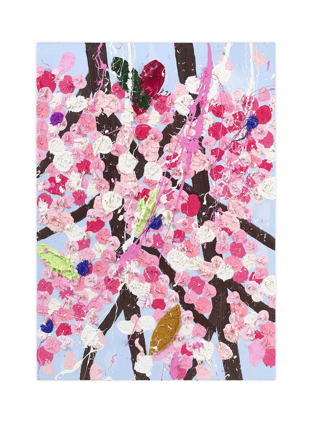 Paper Blossoms is a series of 900 unique original paintings on card featuring the vibrant imagery of Hirst's Cherry Blossoms paintings.