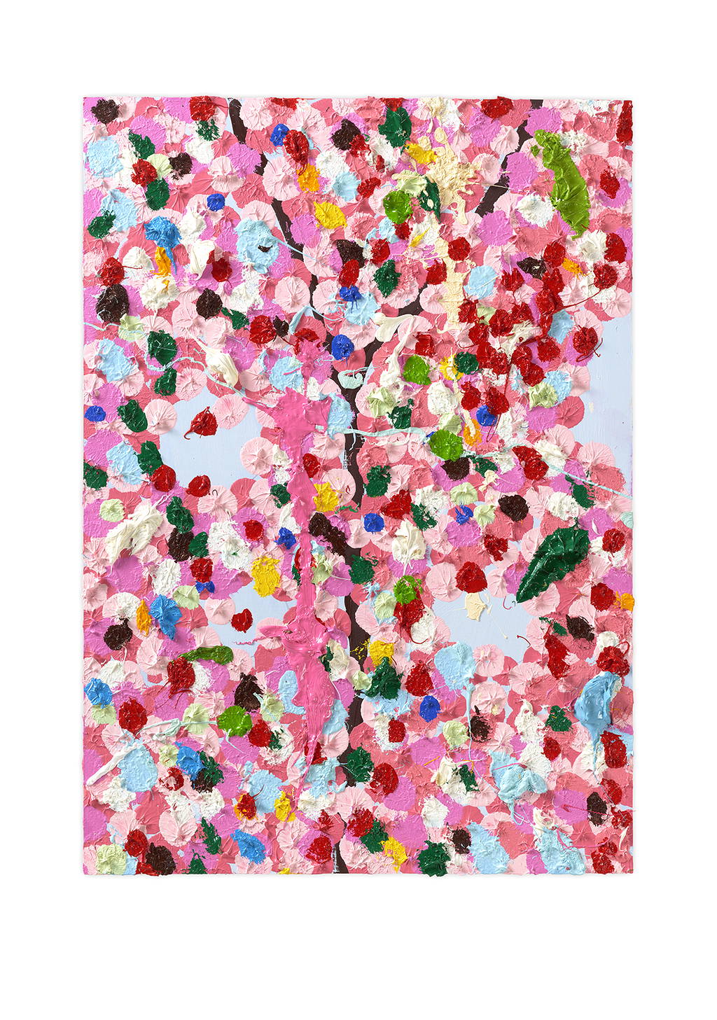 Paper Blossoms is a series of 900 unique original paintings on card featuring the vibrant imagery of Hirst's Cherry Blossoms paintings.