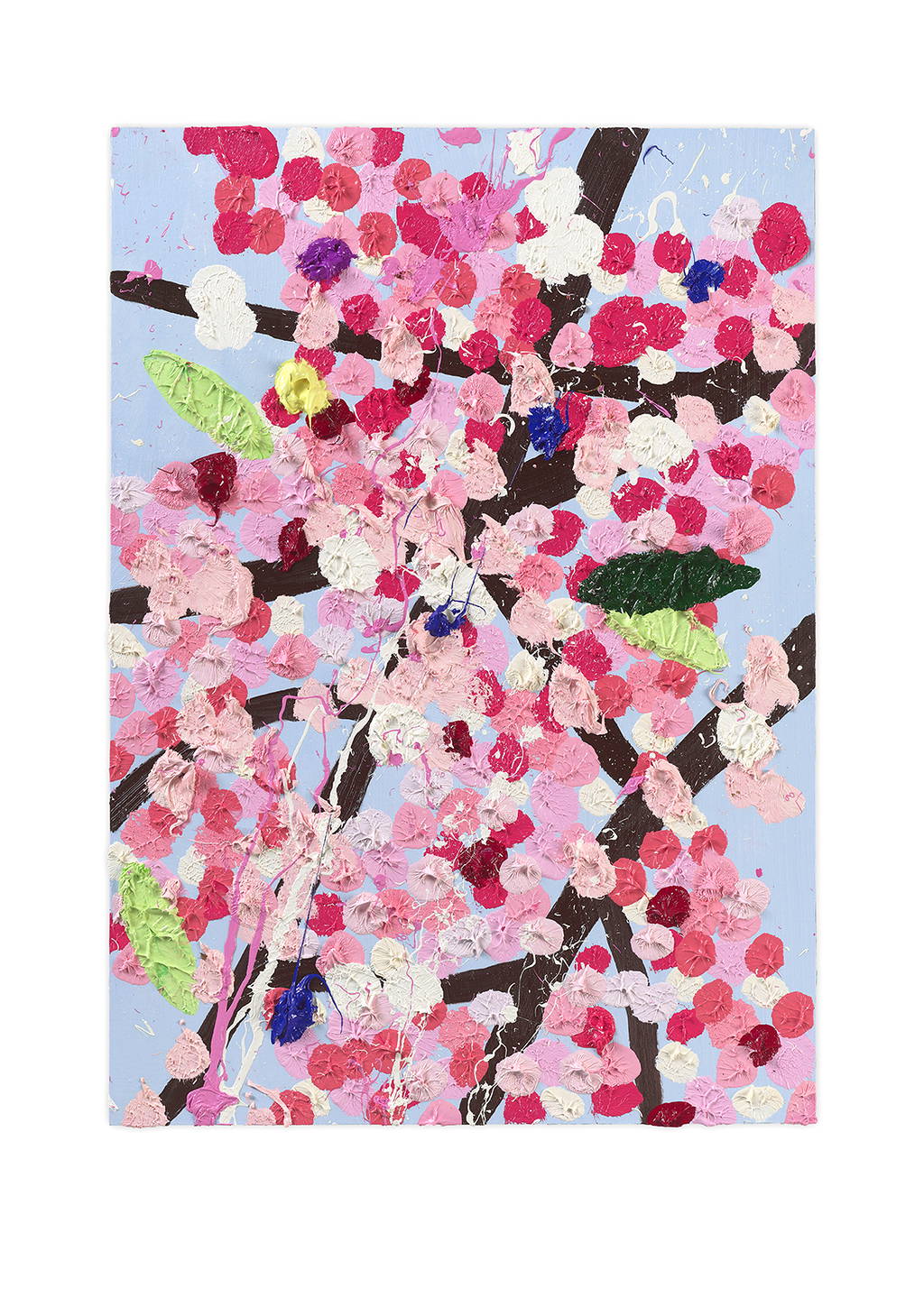 Paper Blossoms is a series of 900 unique original paintings on card featuring the vibrant imagery of Hirst's Cherry Blossoms paintings.