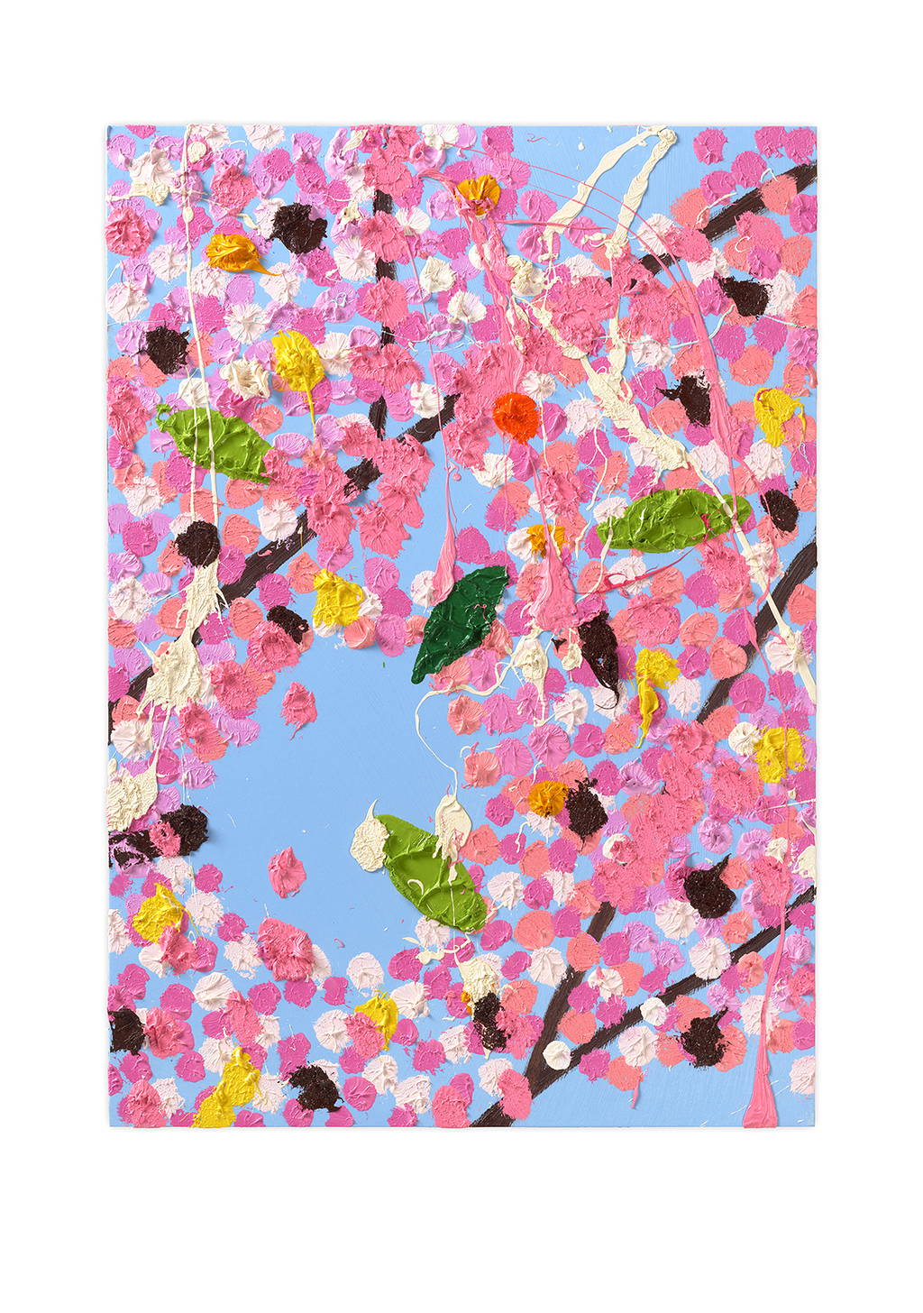 Paper Blossoms is a series of 900 unique original paintings on card featuring the vibrant imagery of Hirst's Cherry Blossoms paintings.