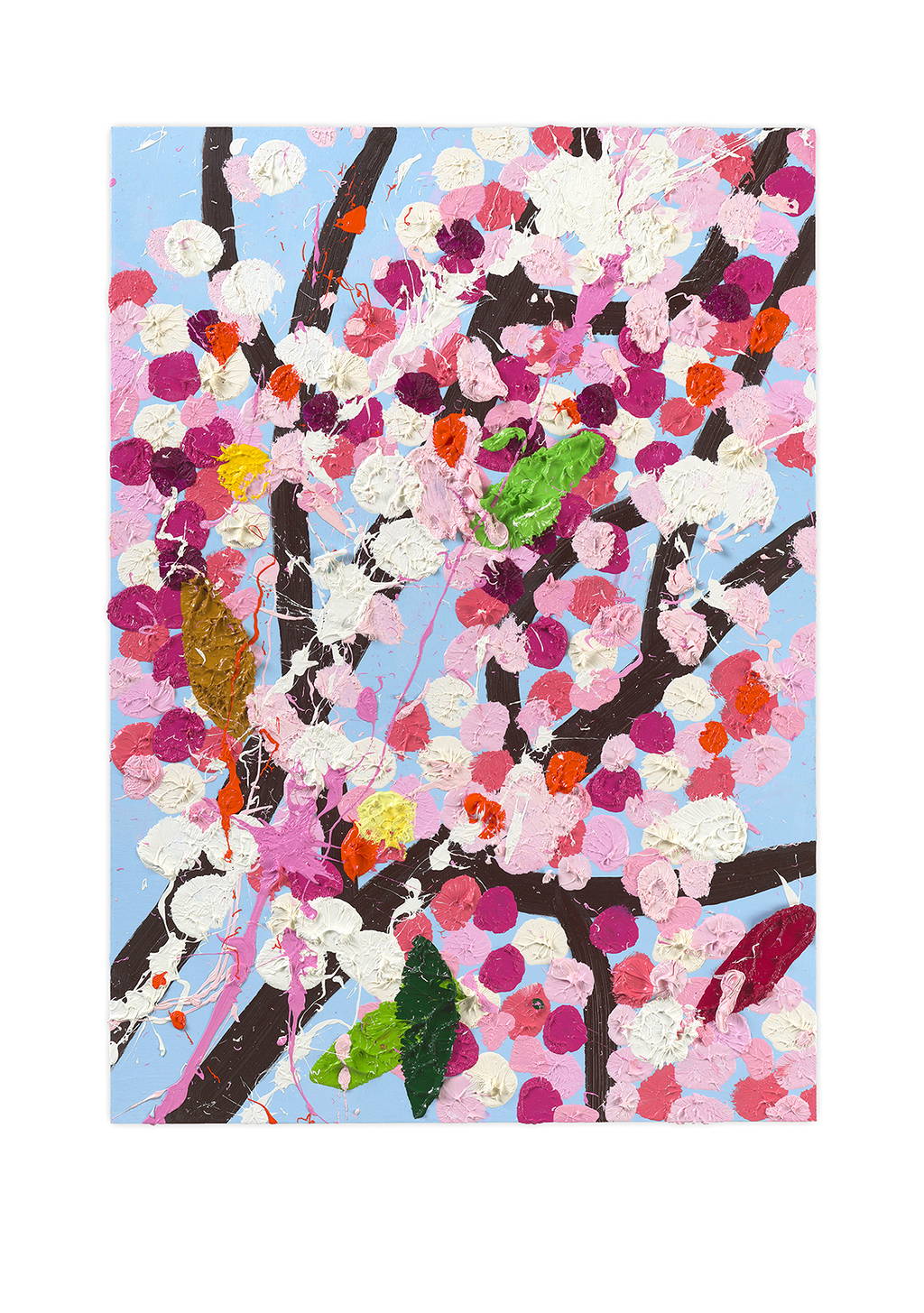 Paper Blossoms is a series of 900 unique original paintings on card featuring the vibrant imagery of Hirst's Cherry Blossoms paintings.