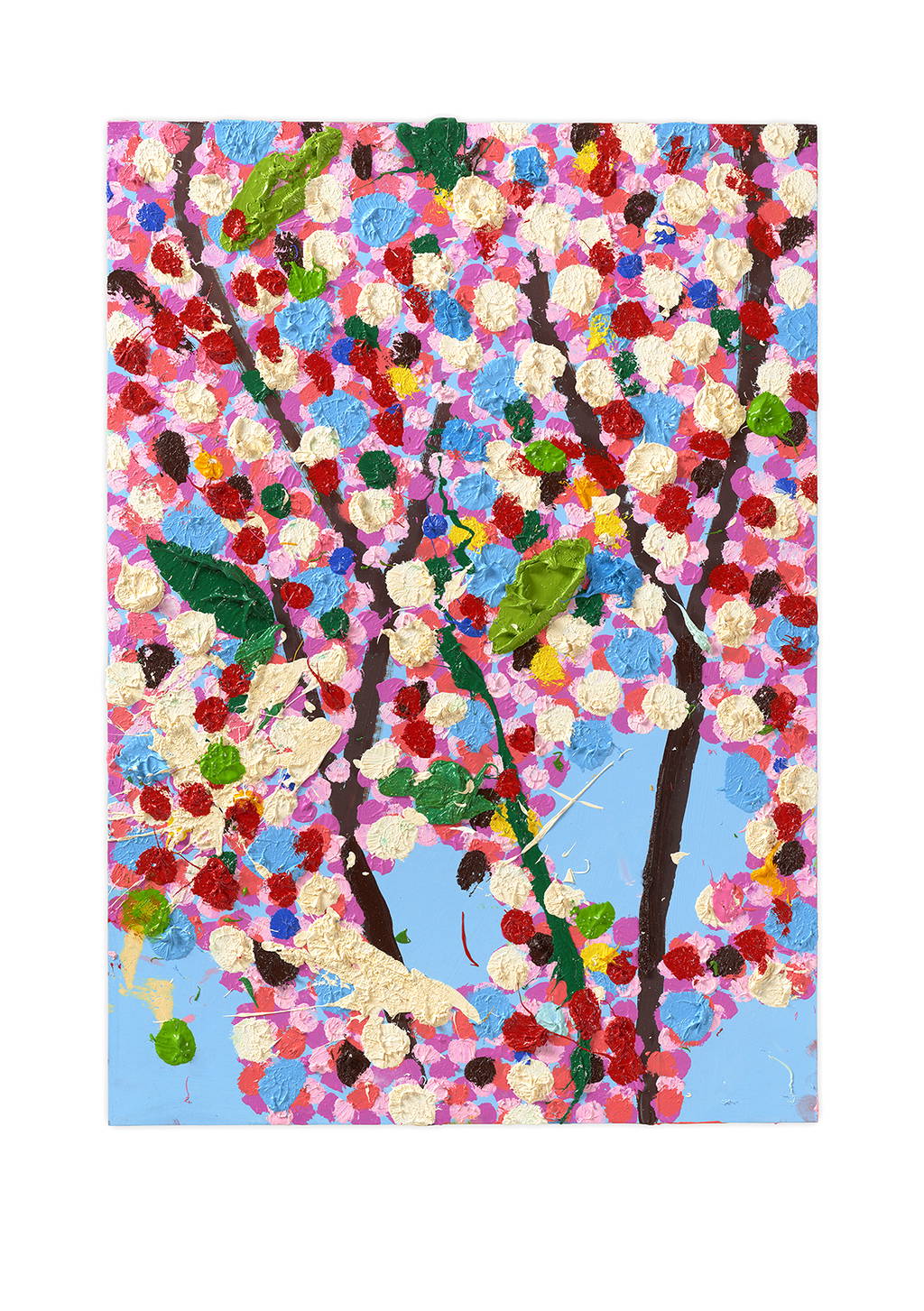 Paper Blossoms is a series of 900 unique original paintings on card featuring the vibrant imagery of Hirst's Cherry Blossoms paintings.