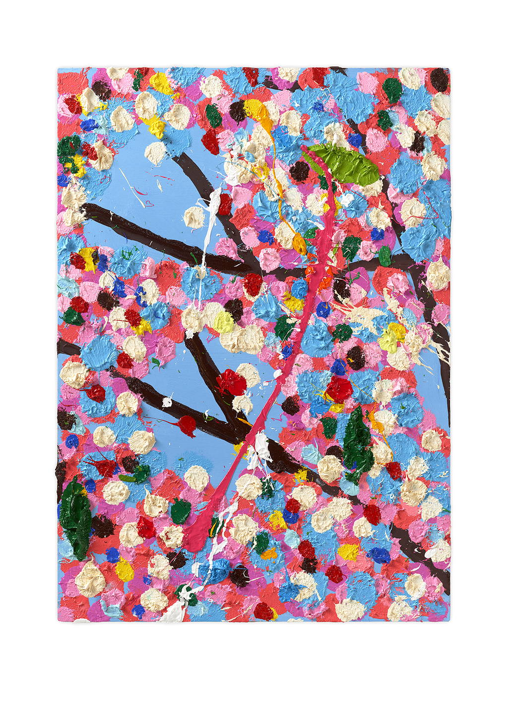 Paper Blossoms is a series of 900 unique original paintings on card featuring the vibrant imagery of Hirst's Cherry Blossoms paintings.