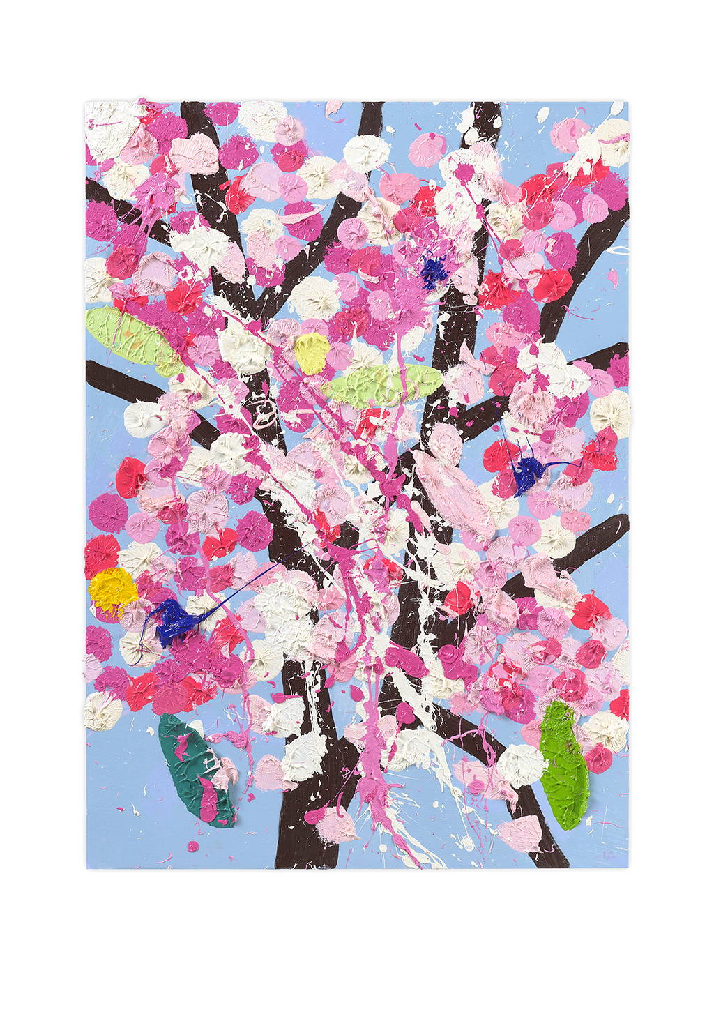 Paper Blossoms is a series of 900 unique original paintings on card featuring the vibrant imagery of Hirst's Cherry Blossoms paintings.