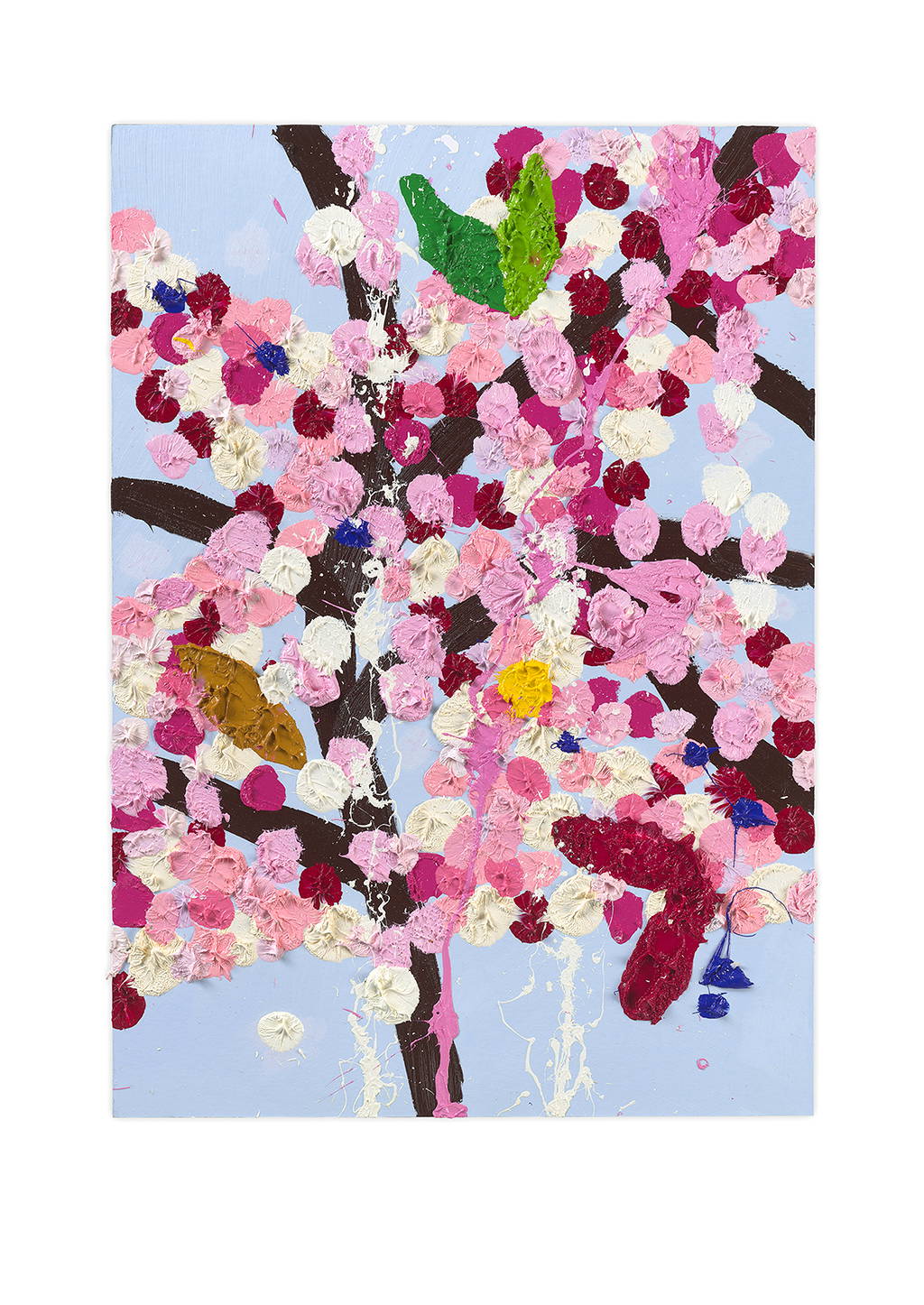 Paper Blossoms is a series of 900 unique original paintings on card featuring the vibrant imagery of Hirst's Cherry Blossoms paintings.